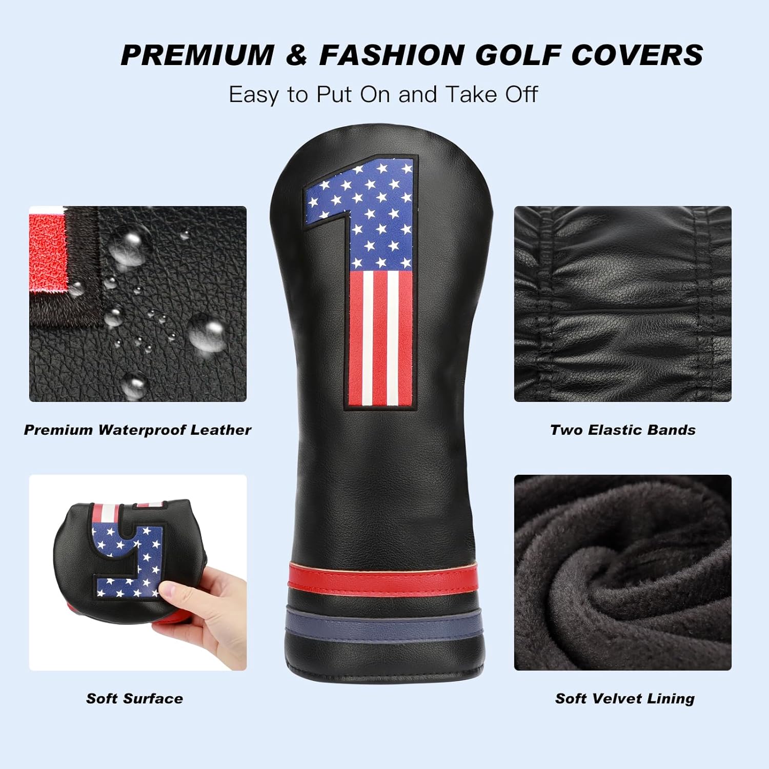 - Patriotic Design with USA Flag : Embody your pride for the country with golf club headcovers that proudly feature the stars and stripes of the American flag. These covers not only protect your clubs but also let you display your patriotism every time you're on the course.