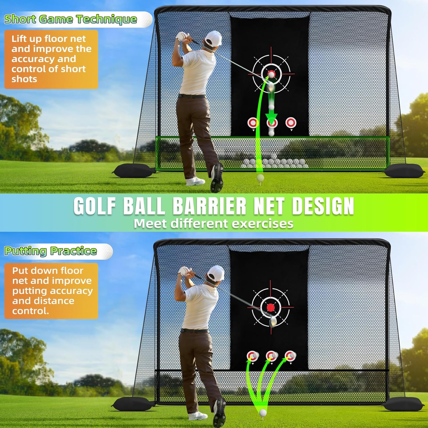 - ššš ššššššš ššš šššš šššššššššš šššš: The detachable net bag design of the golf practice net, Put down net bag and improve putting accuracy and distance control. Lift up net bag and improve the accuracy and control of short shots, and collect golf balls well to reduce the time spent picking up balls and focus more on practice.