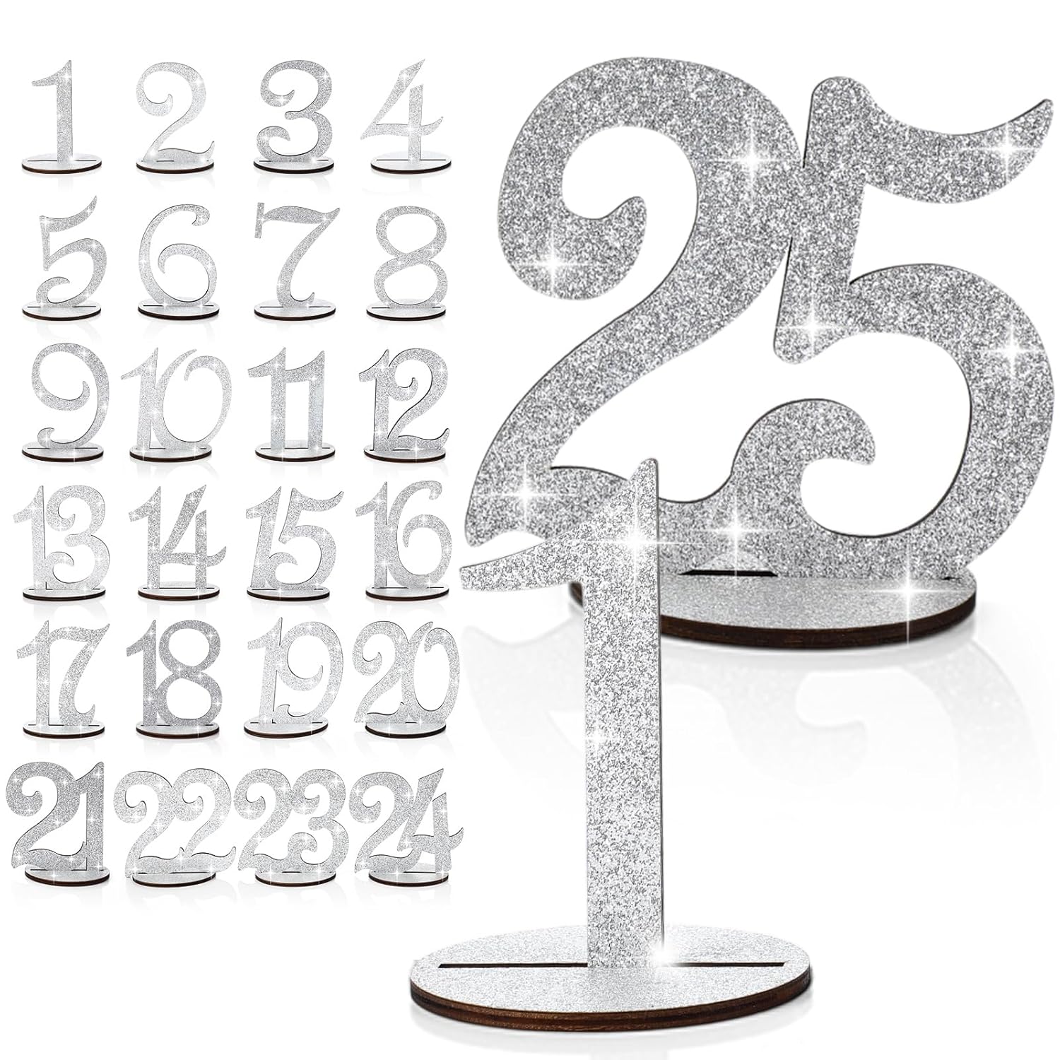 Glitter Table Numbers 1-25 Wooden Table Numbers for Wedding Reception Standing Seat Place Cards with Holder Base for Wedding Party Event Catering Receptions Banquets(Sliver)