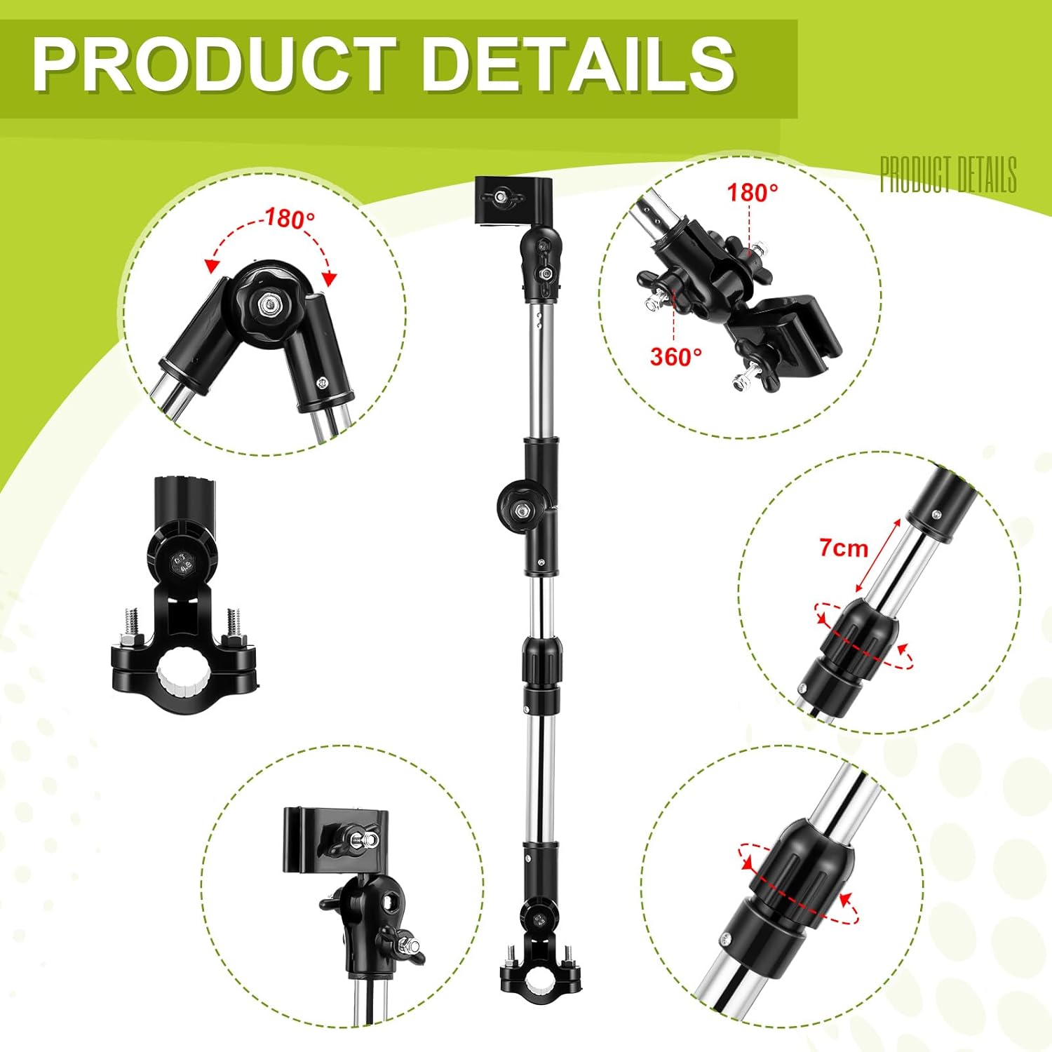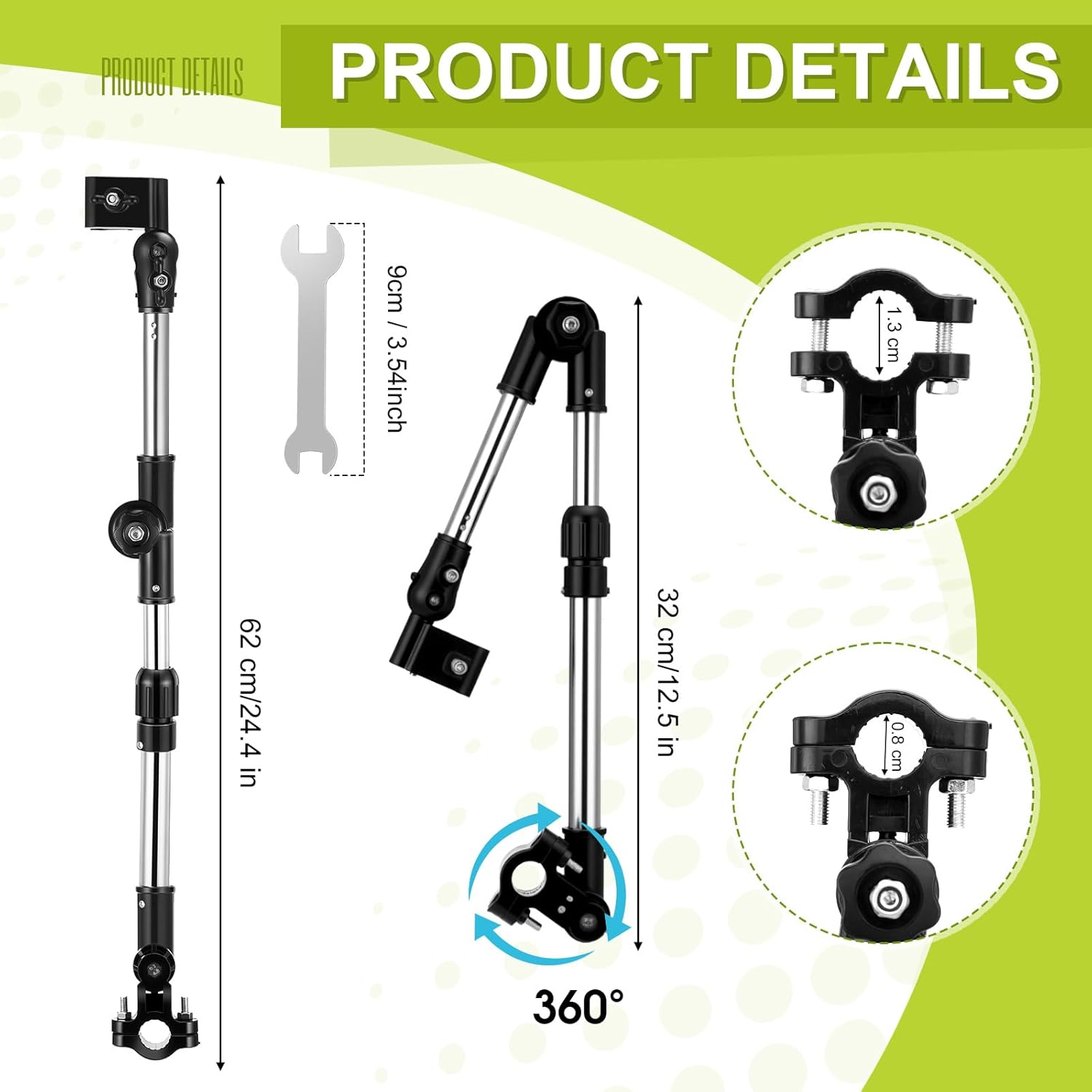 - Size: the fully extended length of the umbrella frame is 24.4 inches; It is suitable for umbrellas with a diameter of 0.8–1.3 cm, wheelchair handlebars about 20 mm in diameter, and chair diameters up to 2.5 cm