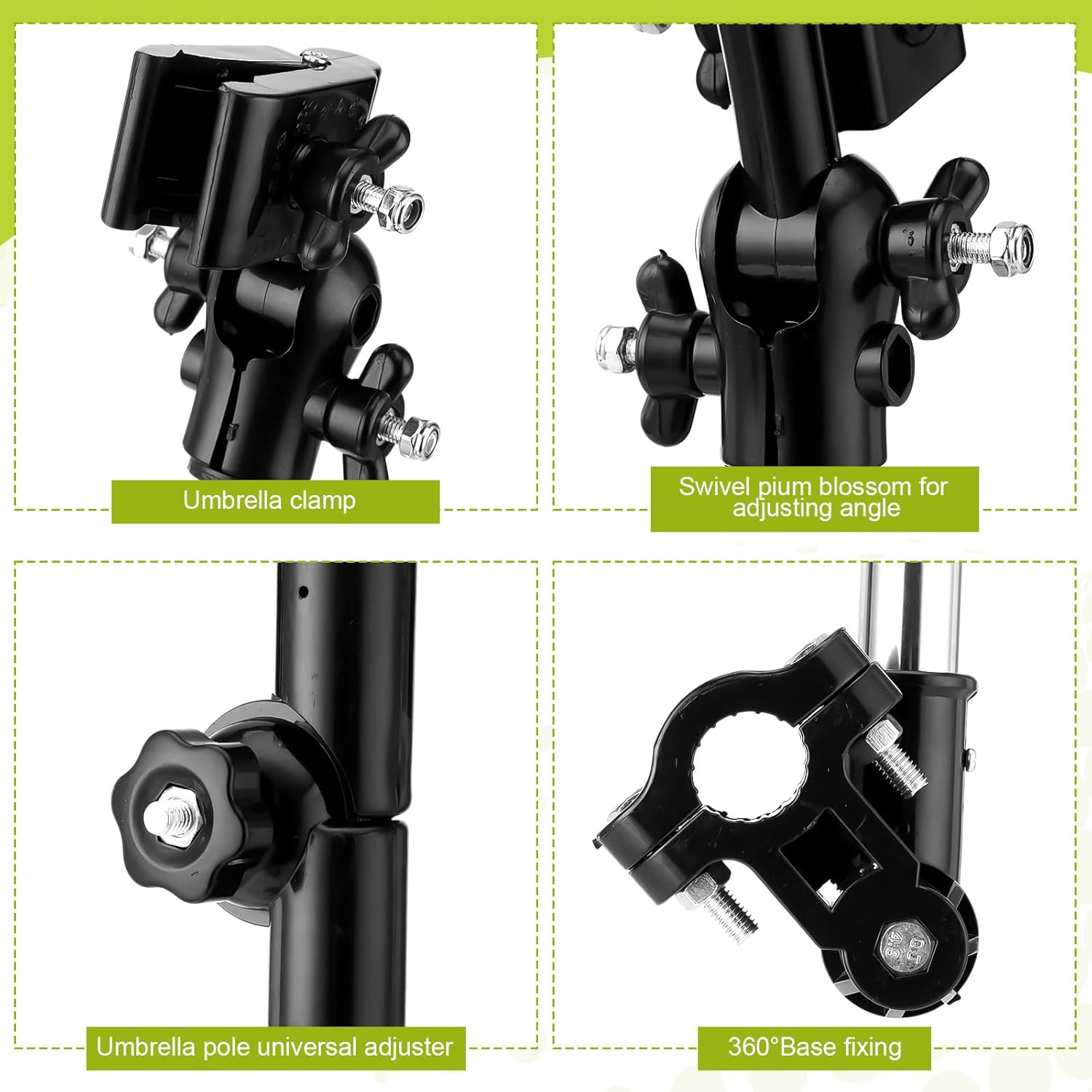 - No Assembly Hassles: right out of the box, it's fully functional; Simply open the bottom bracket, fix the clamp firmly, and adjust it as needed; During each adjustment, make sure to tighten it securely to prevent any slipping, thus maximizing the performance of the umbrella clip