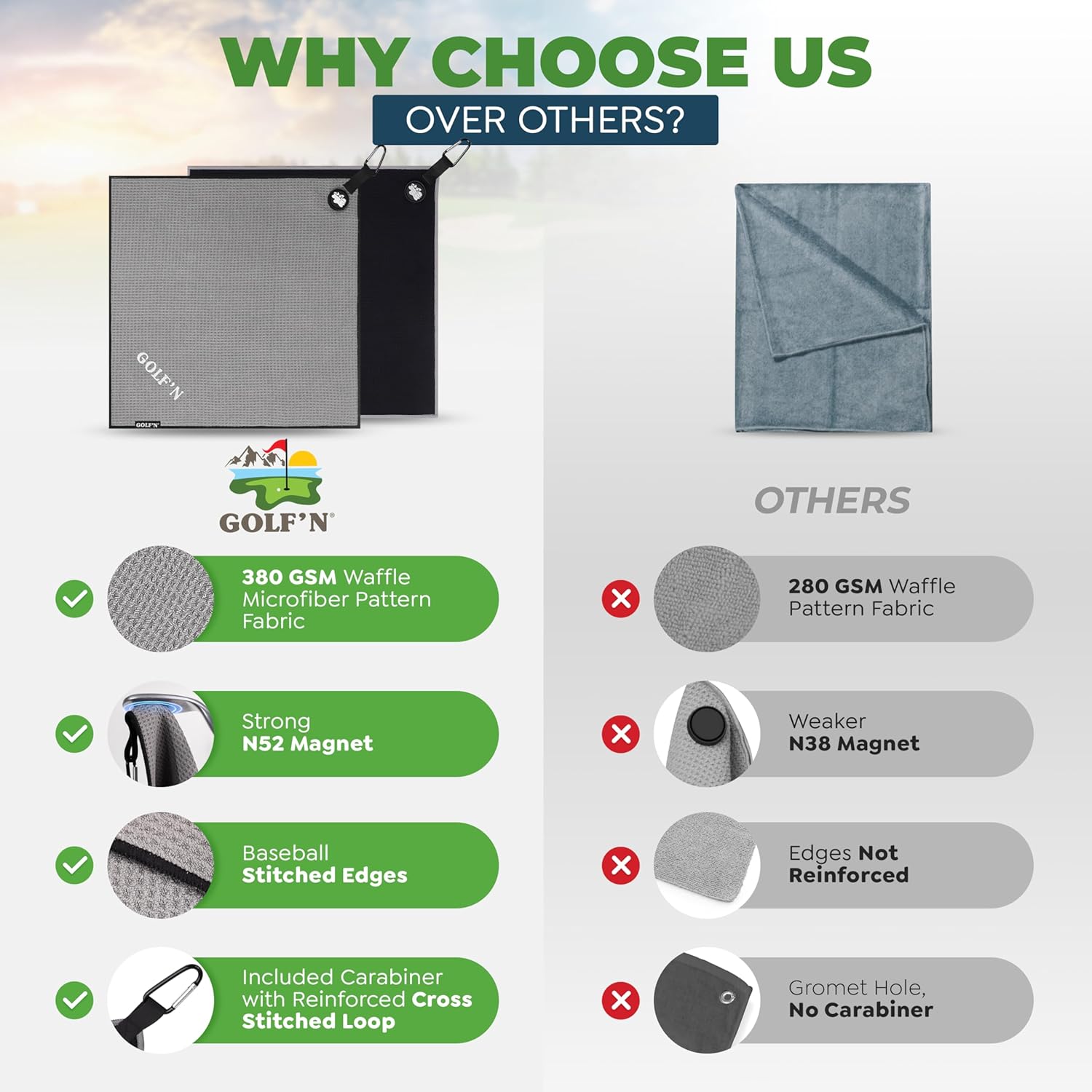 - Magnetic Attachment: Experience unmatched convenience with our magnetic golf towel, designed with N52 heavy duty magnets, perfect for effortless attachment to any golf cart. This makes it an essential golf cart accessory for both mens golf and womens golf players. Get your Golf'N magnet golf towel today..