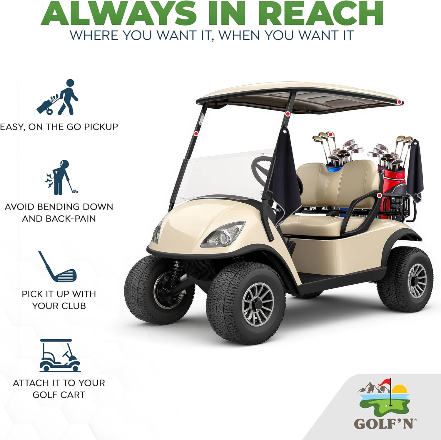 - Magnetic Attachment: Experience unmatched convenience with our magnetic golf towel, designed with N52 heavy duty magnets, perfect for effortless attachment to any golf cart. This makes it an essential golf cart accessory for both mens golf and womens golf players. Get your Golf'N magnet golf towel today..