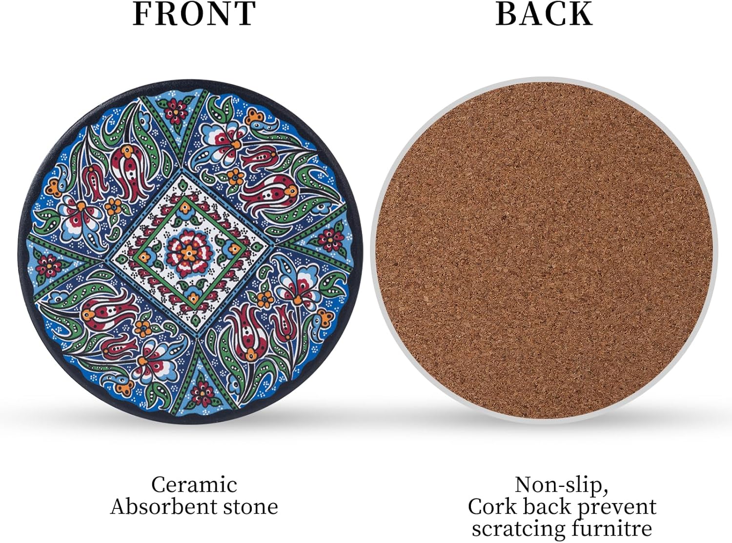 Coasters Absorbent Ceramic Coaster Drink Coasters with Cork Back Turkish Pattern Set of 6 Round Coaster Non Slip for Coffee Table Wine Glass Home Bar 4 Inch, Colorful