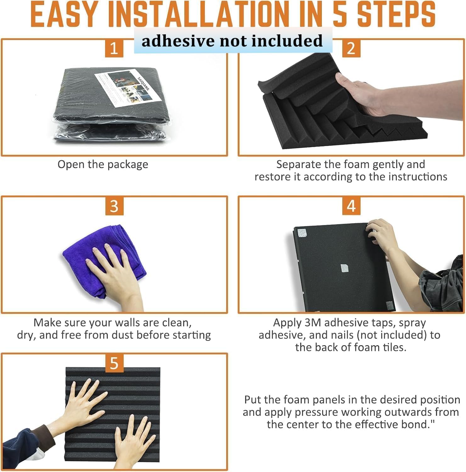 - Sound Insulation Soundproof Foam. - We sell noise cancelling foam panels are non-adhesive. So We recommend using 3M Double Sided Foam Tape that with strong adhesive or pin to install them. Perfect for home studios, offices, gaming rooms, and more, these panels can also good to diy ,you can cut to fit custom shapes and sizes. Please note: Products are packaged in a compressed state.For some products that cannot expand well, they will take longer to expand naturally. Or just put the product in the dryer for a few minutes to expand it to its original shape.