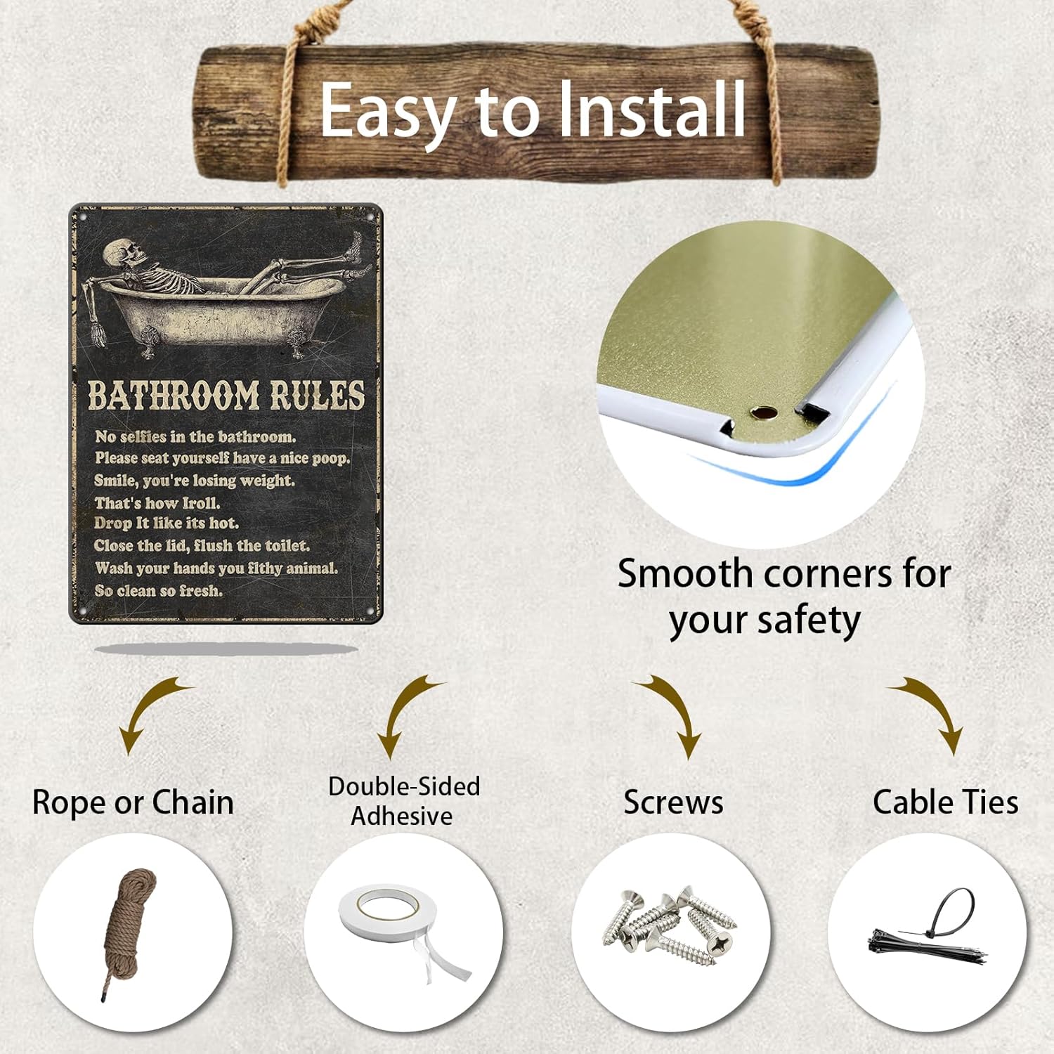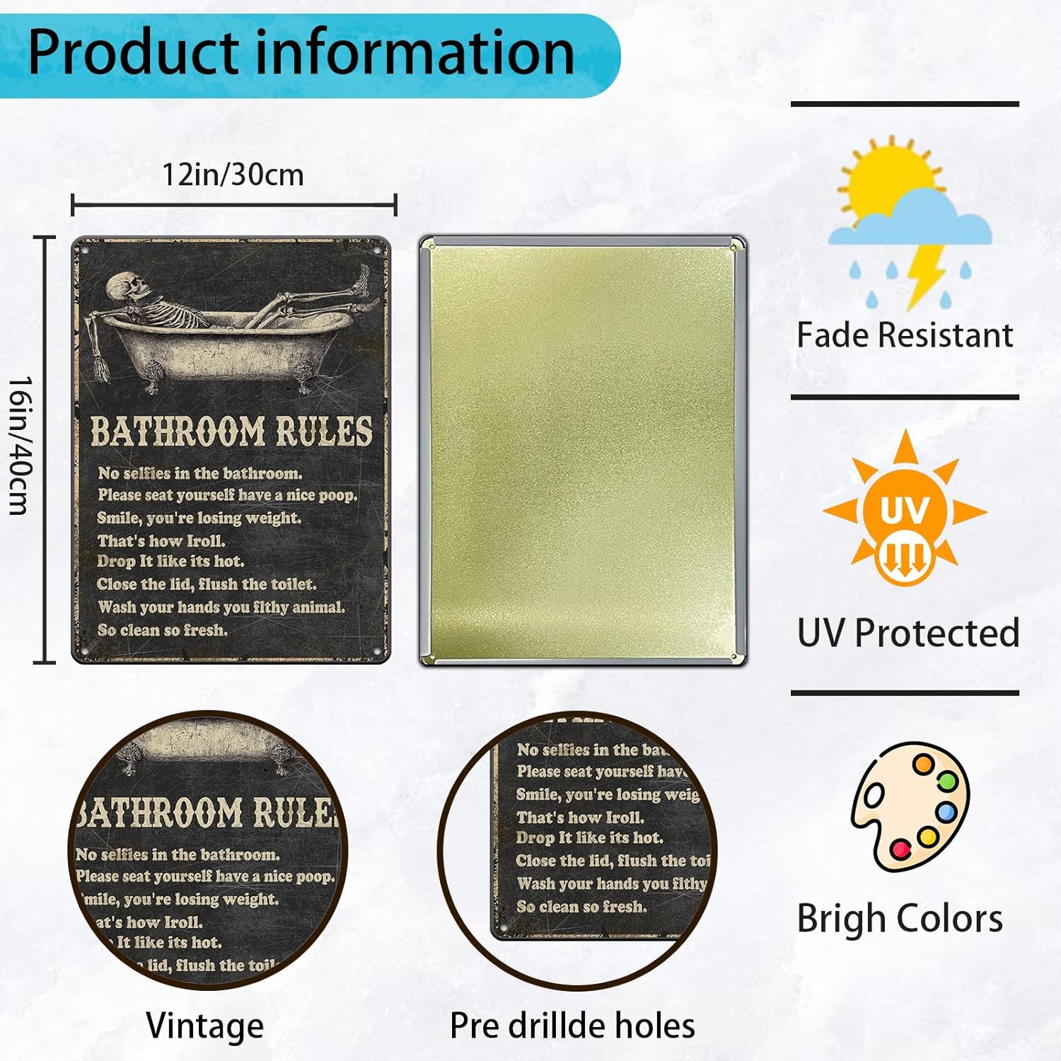 Funny Skull Bathroom Rules Metal Tin Sign Wall Decor - Vintage Bathroom Quote Tin Sign for Toilet Restroom Washroom Home Decor 12x16 Inch