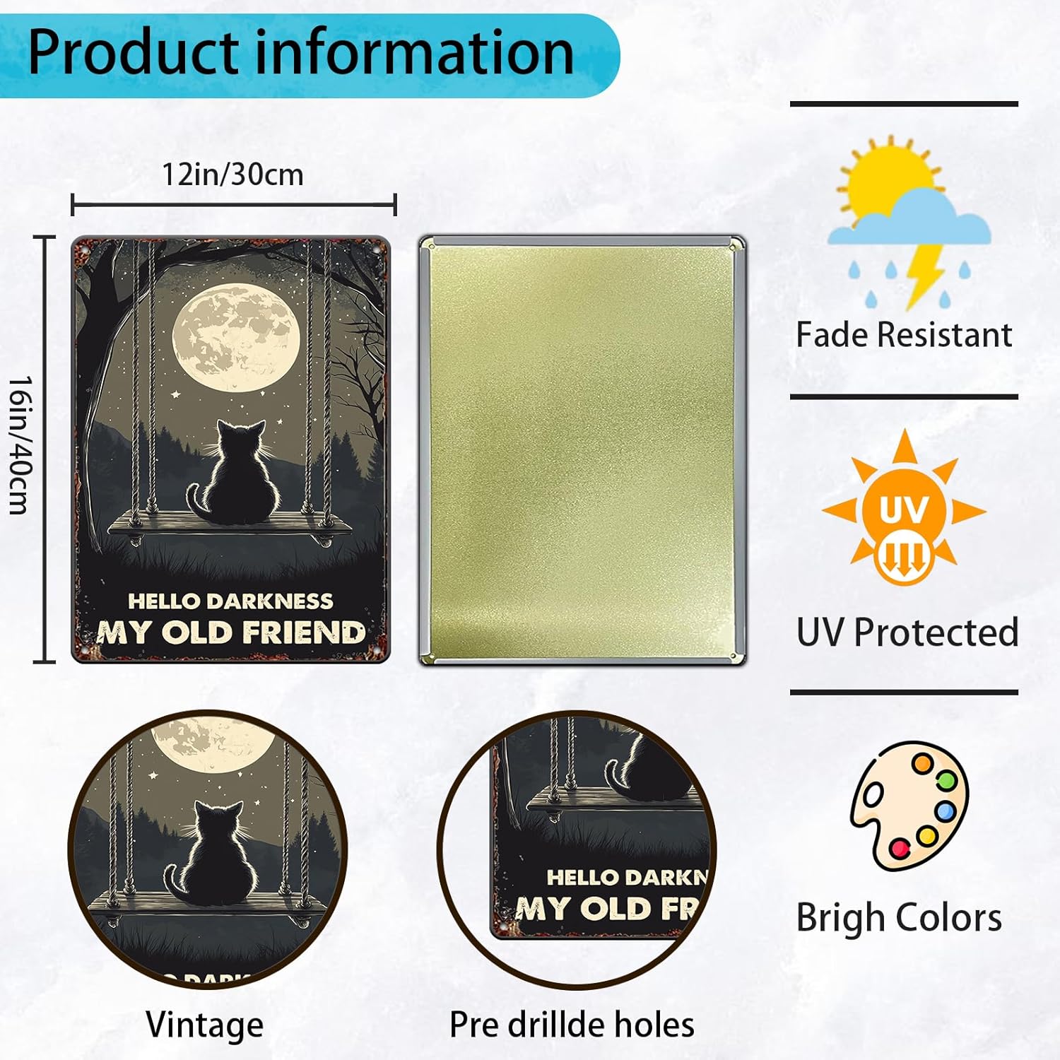 Vintage Wall Decor Metal Poster Plaque Black Cat Hello Darkness My Old Friend Iron Painting Wall Decor Nostalgic Tin Sign For Home Cofe Kitchen Pub Bar 12x16 Inch