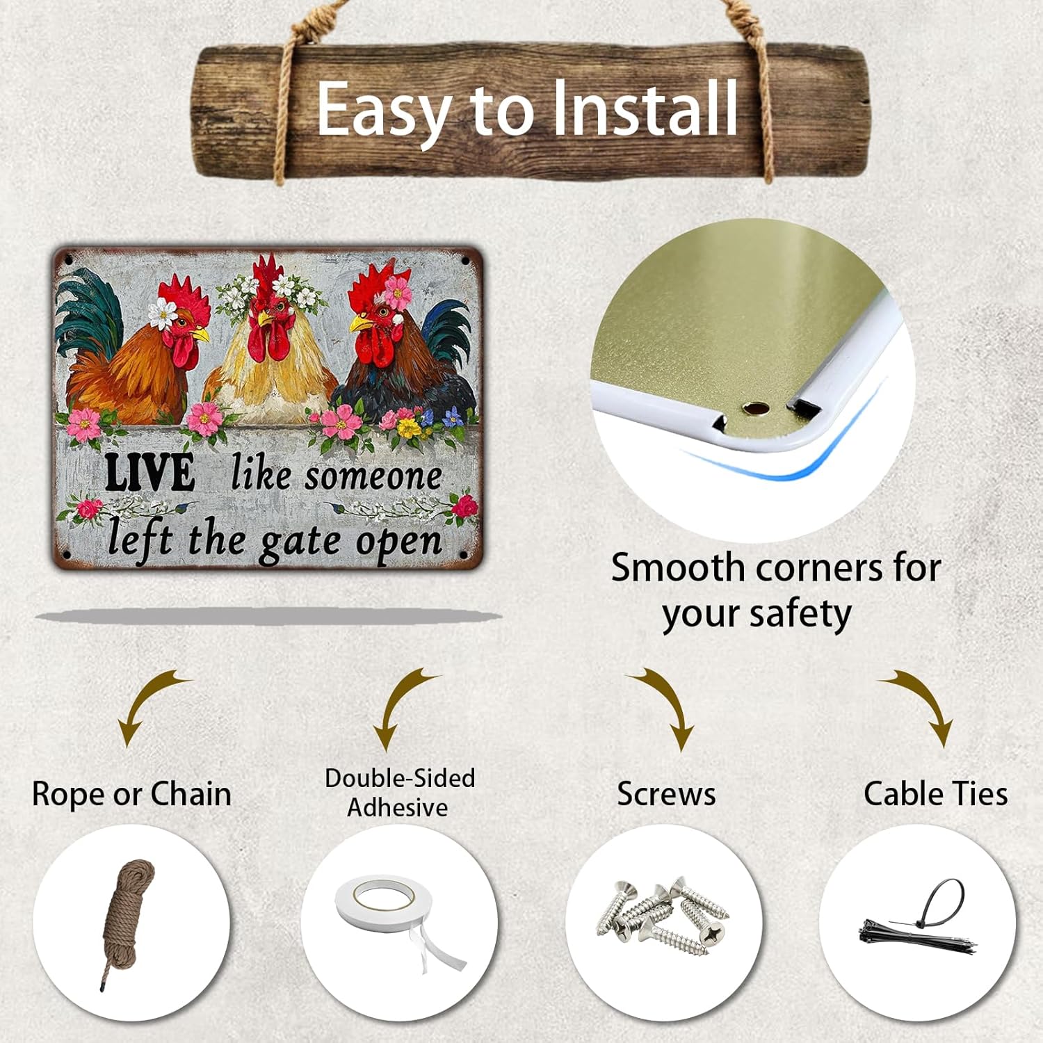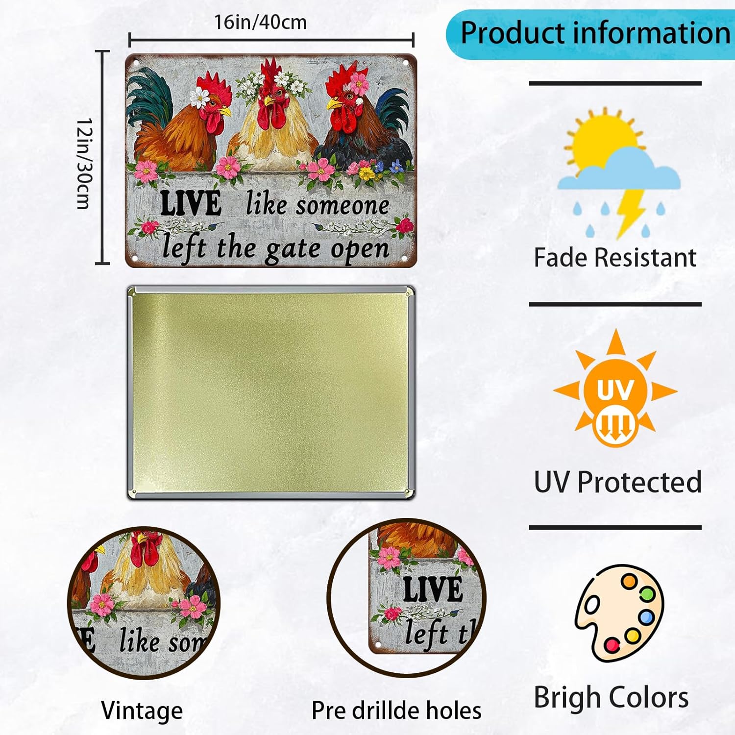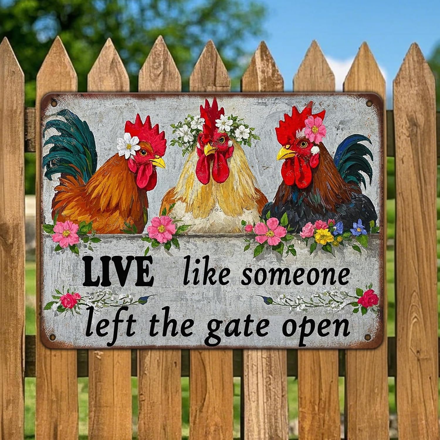 Funny Farmhourse Chicken Coop Metal Tin Signs 12x16 Inch Vintage Chicken Decor Sign Live Like Someone Left The Gate Open Poster Home Kitchen Garden Restaurant Rooster Outdoor Wall Art Decor