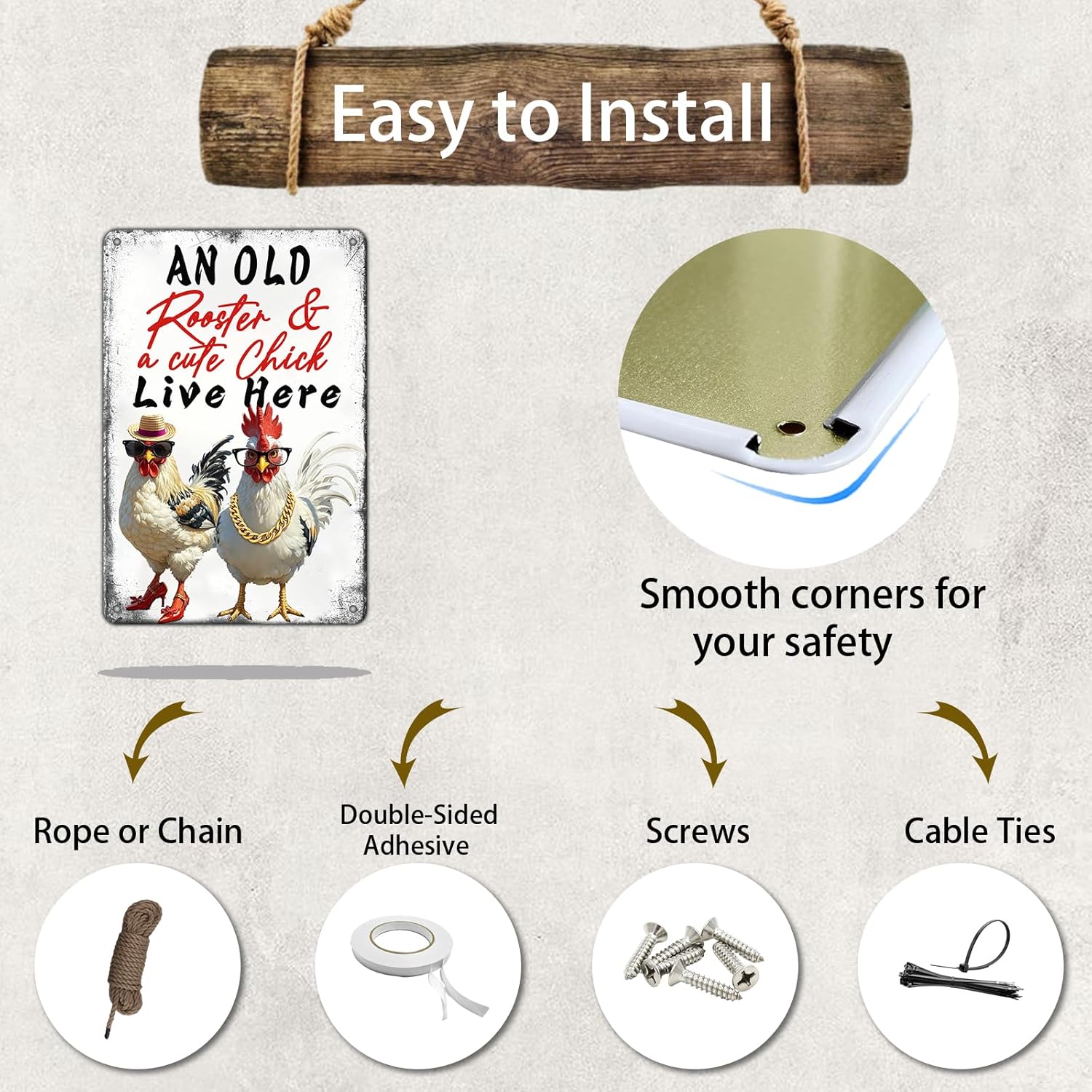 - 3.[Design: ]Funny An Old Rooster & A Cute Chick Live Here Sign The Surface Presents A Retro Classical Effect, Adding Fun To Your Kitchen, Garden, Farmhouse Indoor And Outdoor Home Decoration. It Adds A Sense Of Happiness To People. Four Drill Holes Have Been Reserved For Your Decoration, Which Can Be Hung With Ropes Or Installed On Walls Decor.