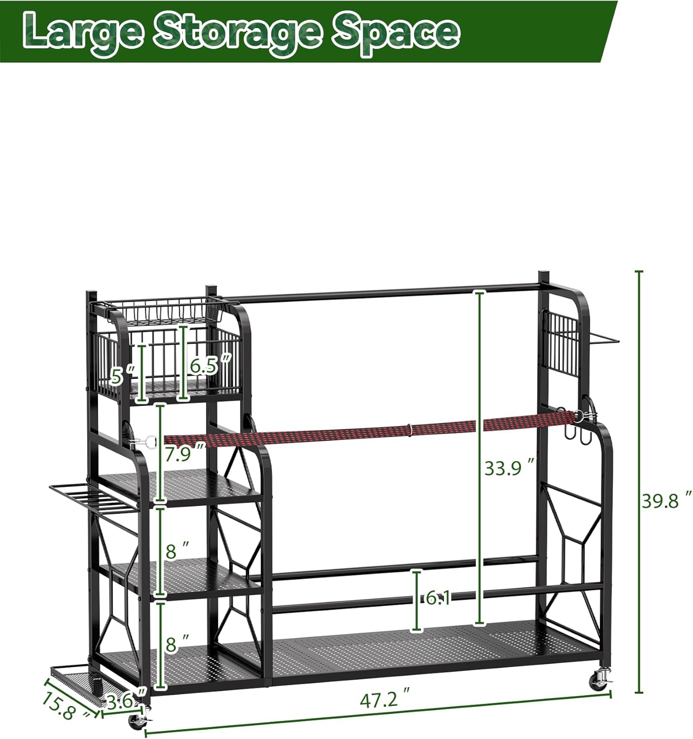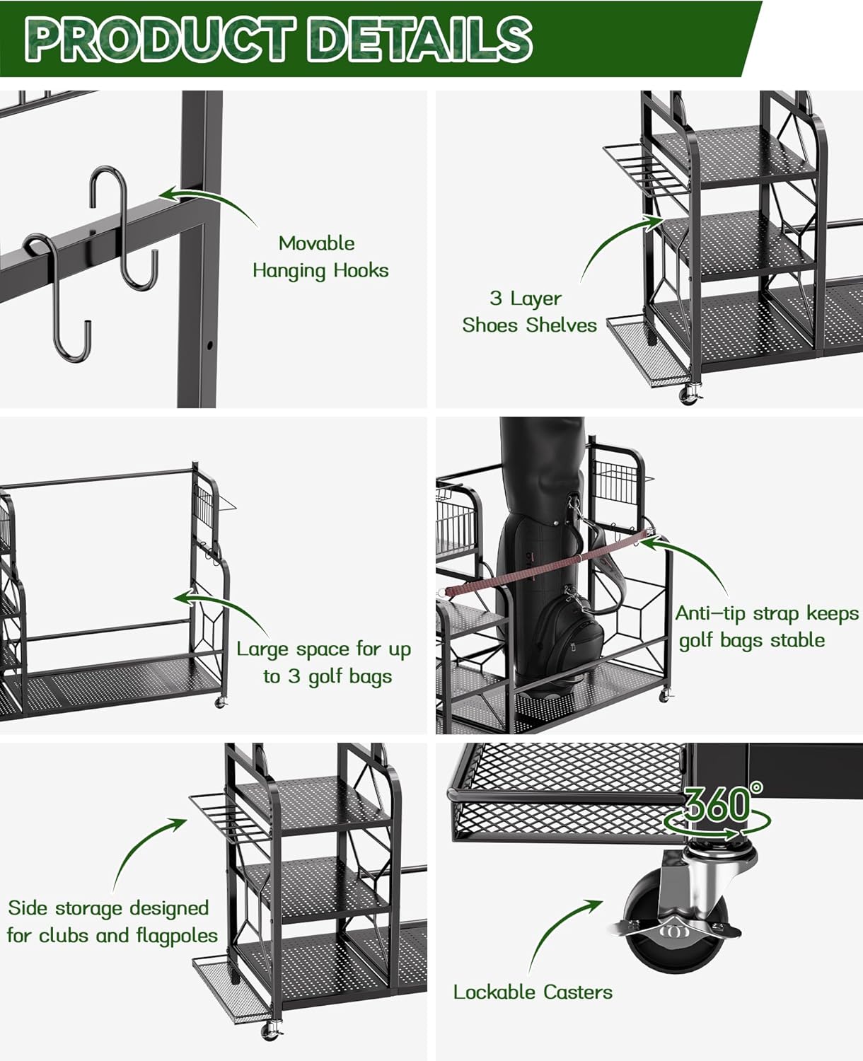 - Lockable Wheels Suitable for Multipurpose Occasions: This golf bag storage rack features 4 universal wheels (2 of them are lockable), which can help you move your golf bags and accessories to different occasions. No matter whether it's in a garage, a golf simulator room, a lawn, or a golf club, it's suitable for use