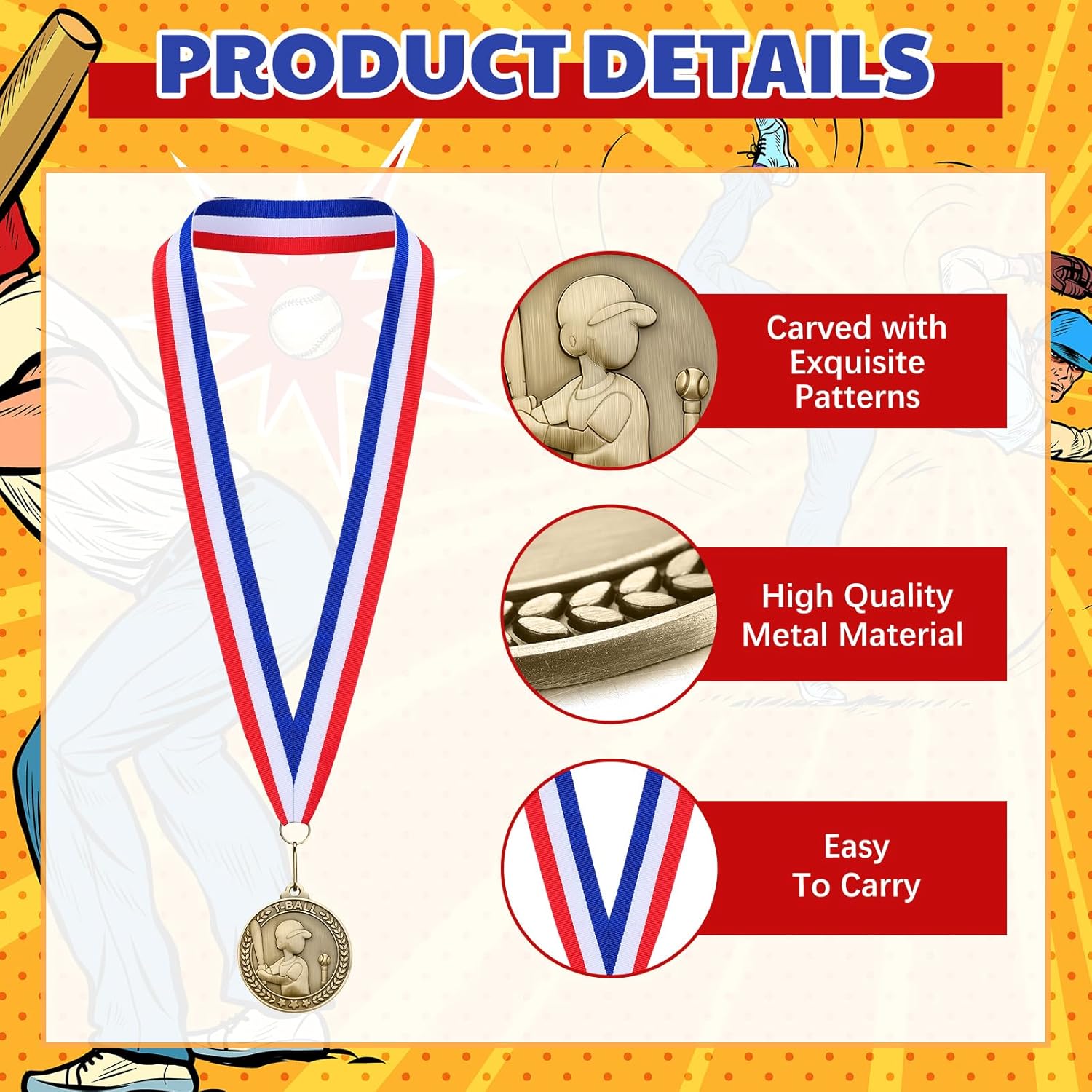 - Attentive Design: our tball medals bulk are made of solid metal with vivid reliefs of the sport of tball; And the attached ribbons ensure these gold medals are easily wearable, making a nice memorabilia