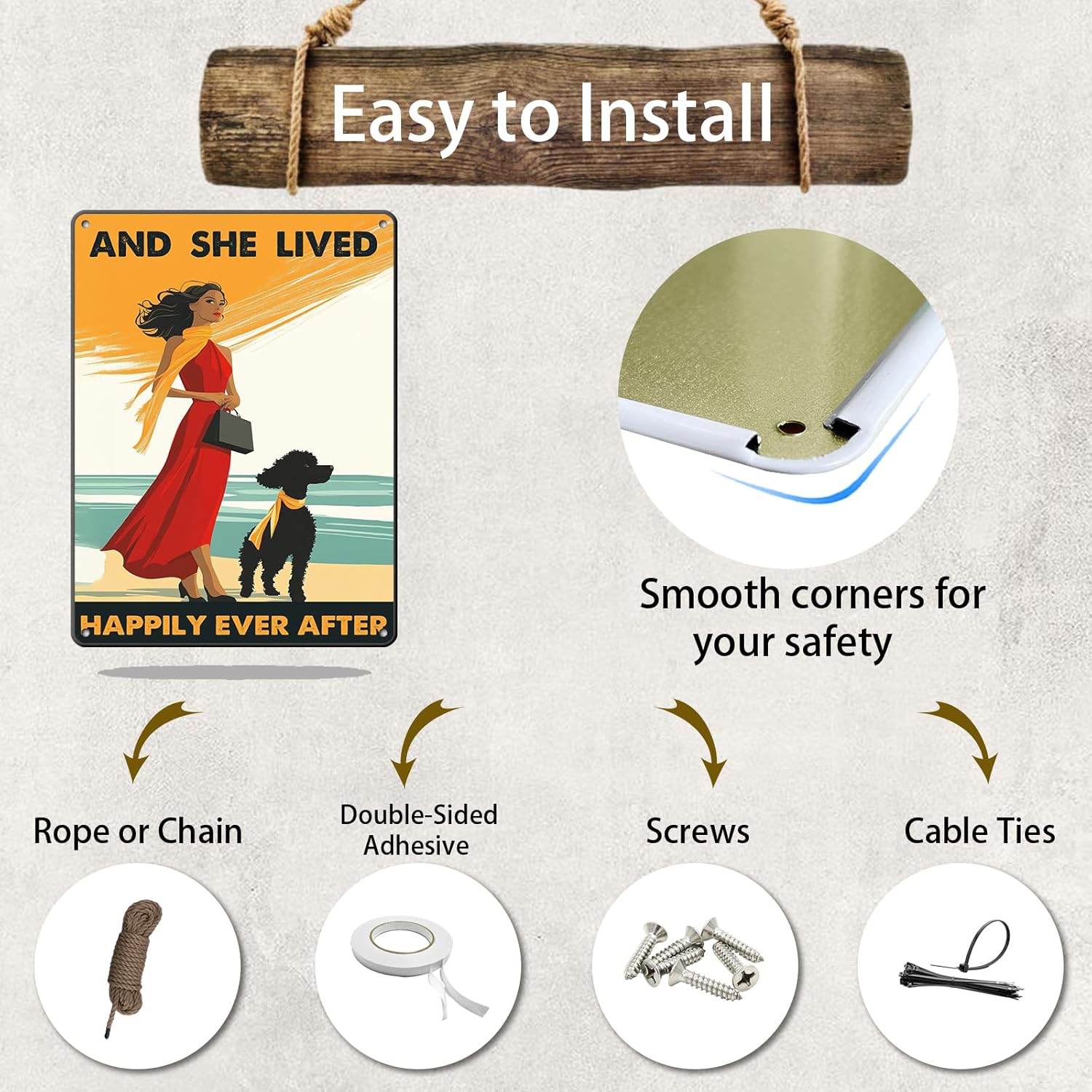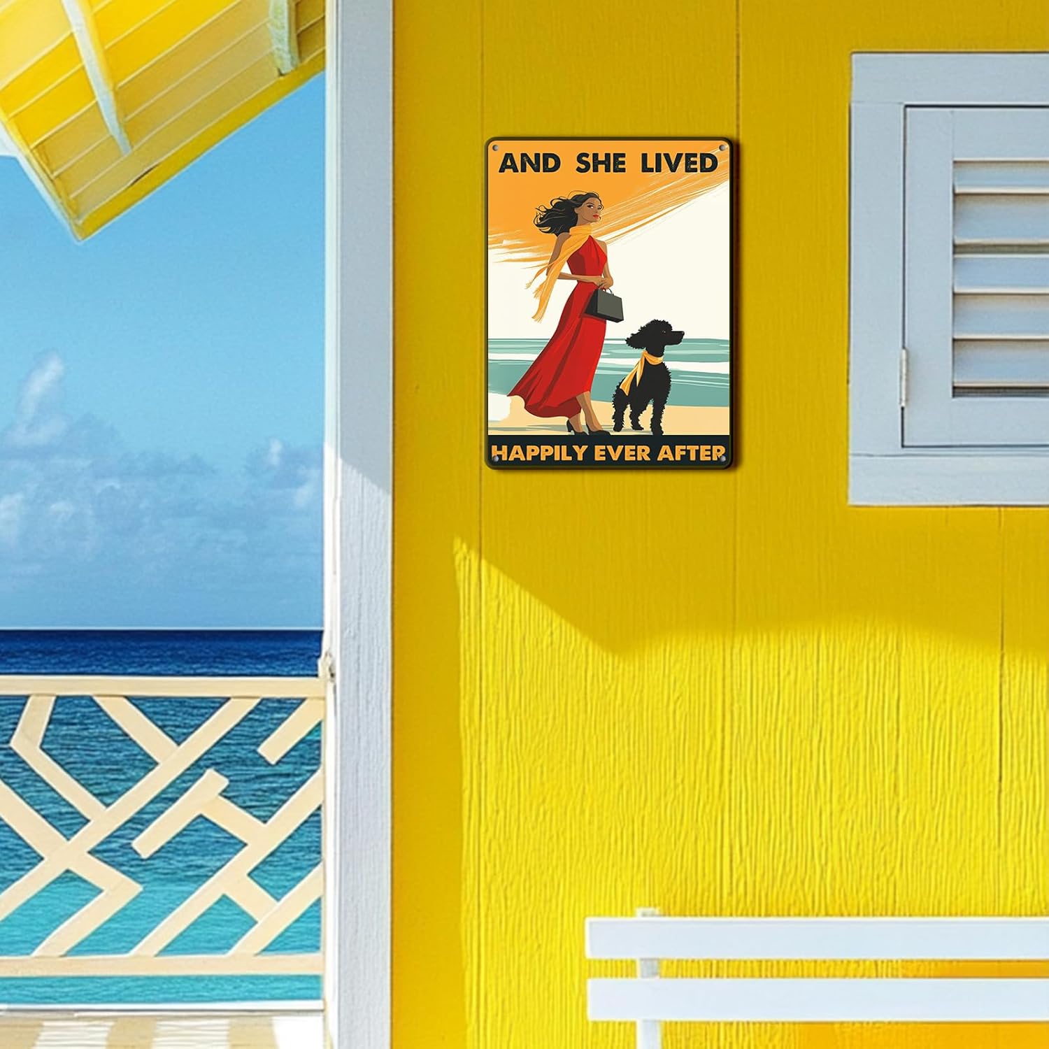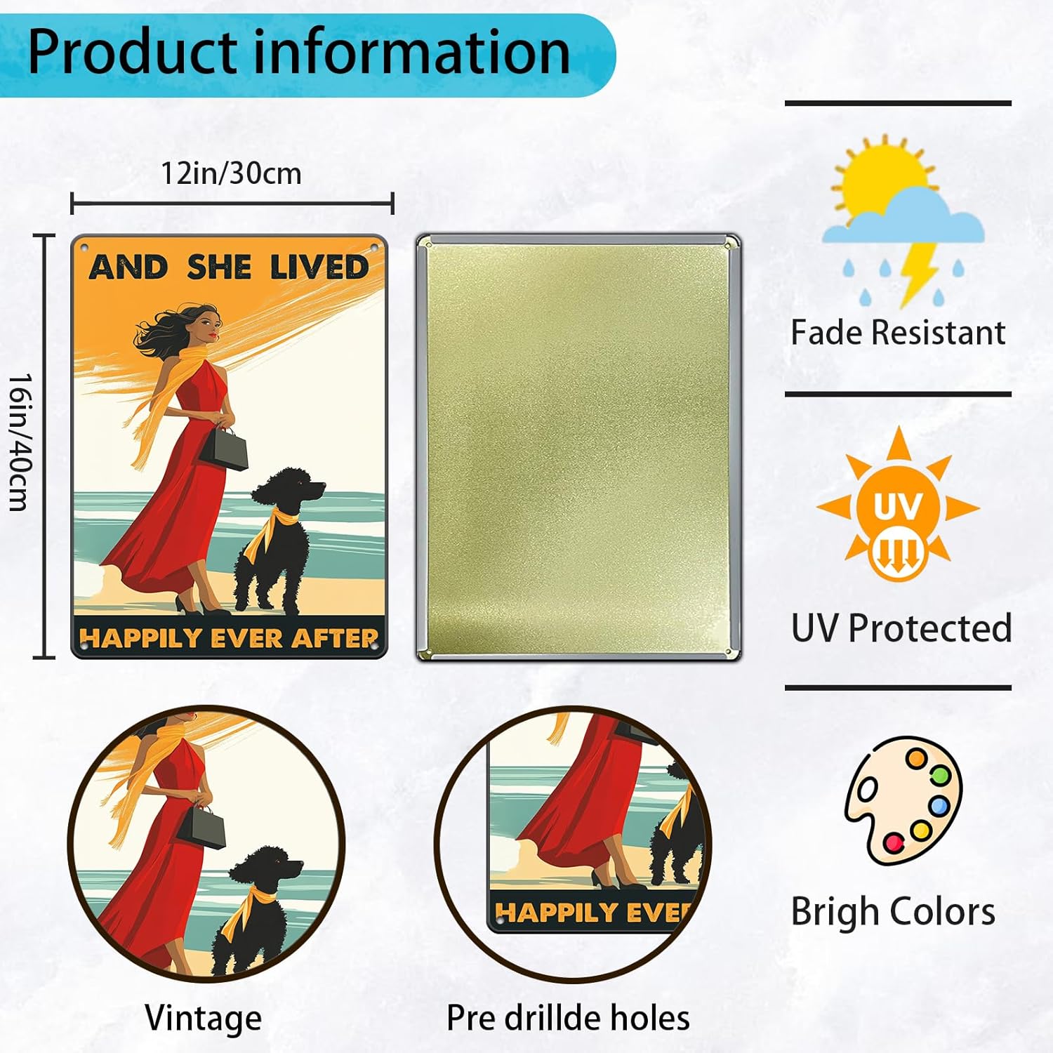 Vintage Tin Sign Metal Poster Plaque Poodle Girl and She Lived Happily Ever After Dog Metal Sign Iron Painting Retro Wall Decor Poster for Home Hotel Cafes 12x16 Inch