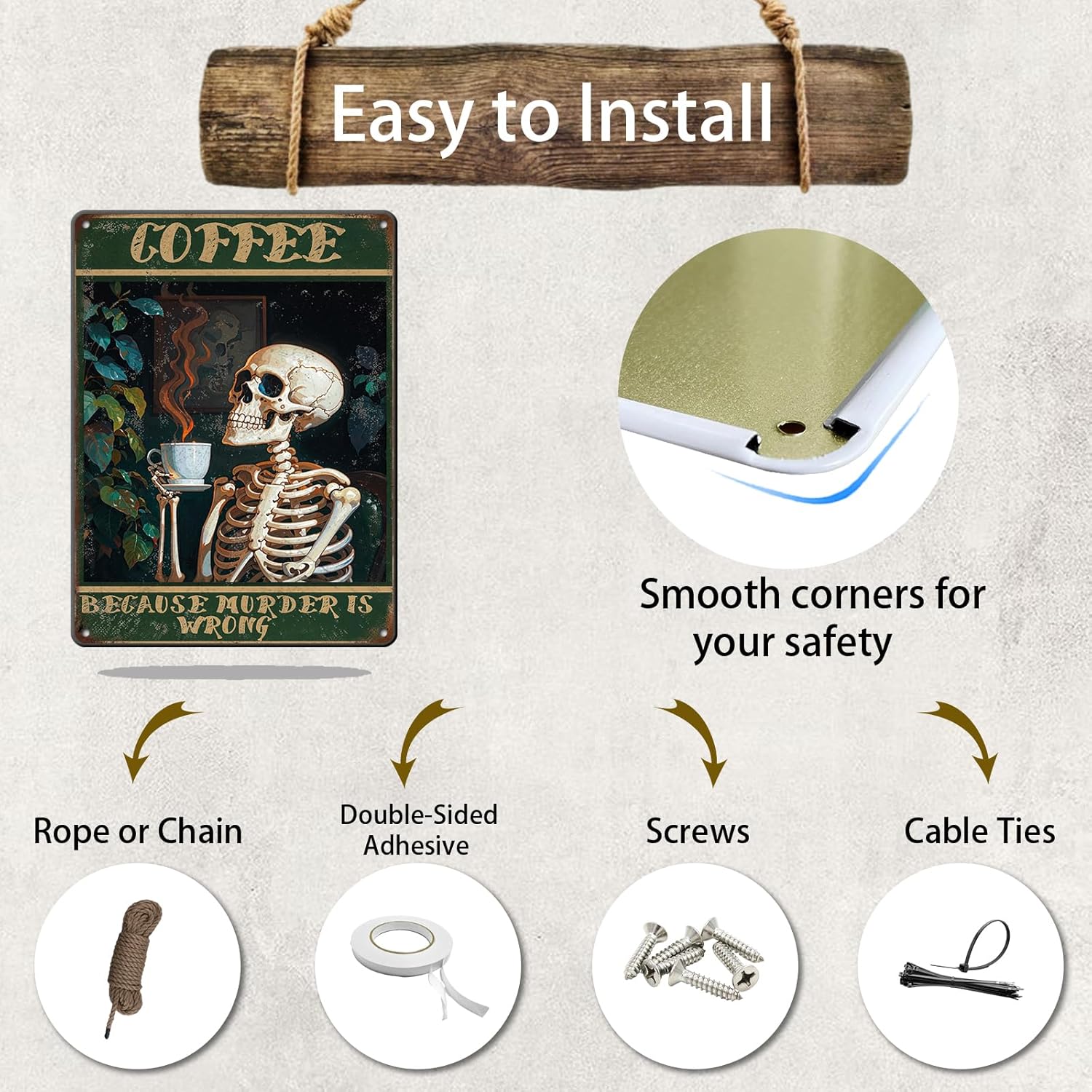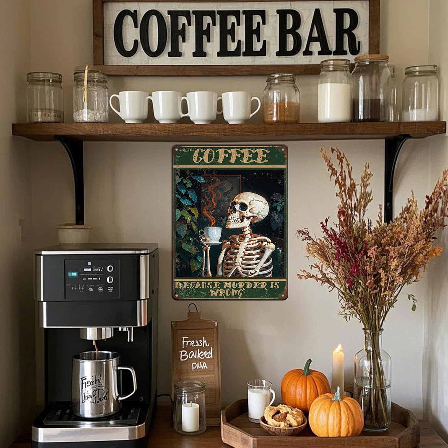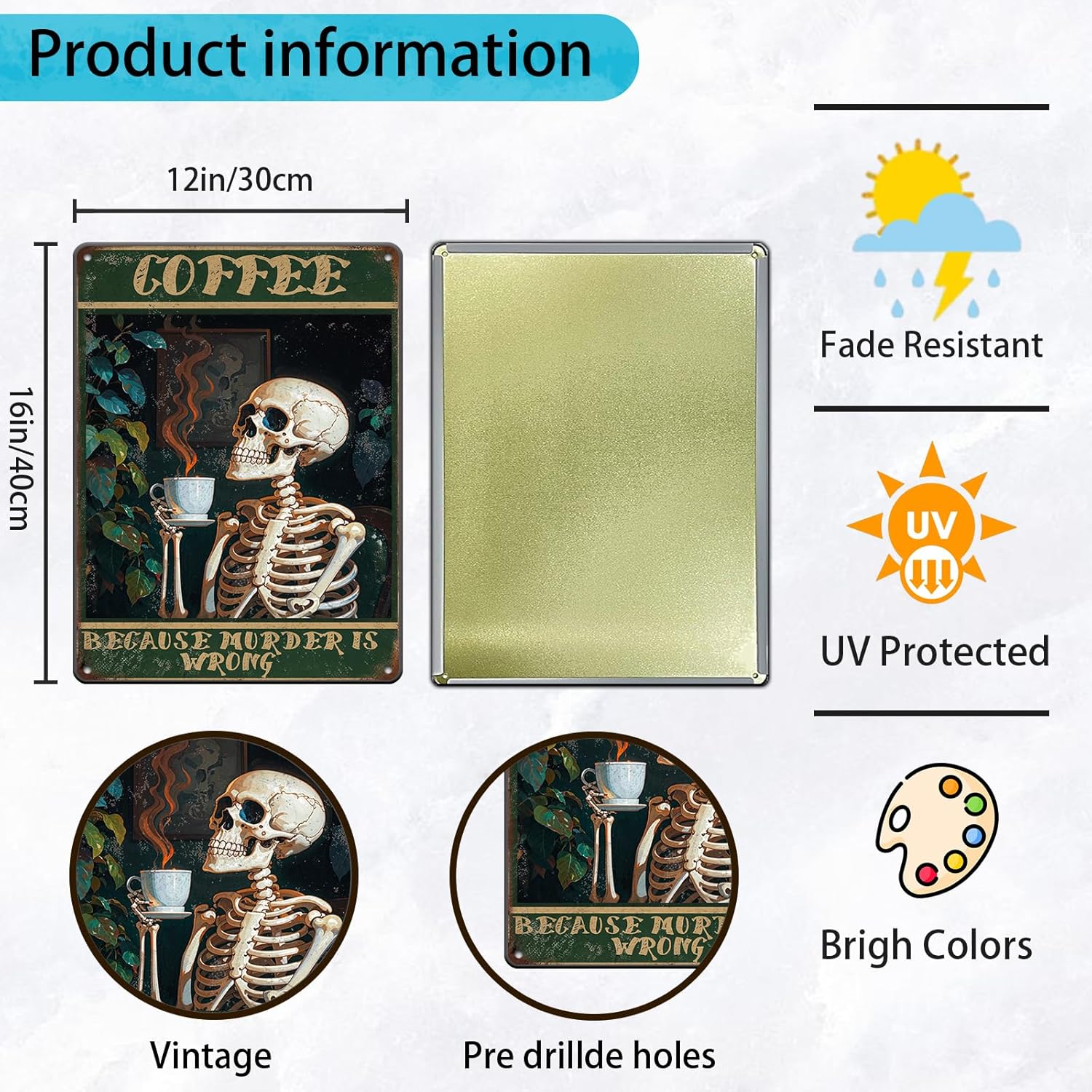 Vintage Coffee Skull Tin Sign Skeleton Old Fashioned Because Murder Is Wrong Metal Tin Sign Poster 12x16 Inch Home Restaurant Coffee Shop Wall Decor