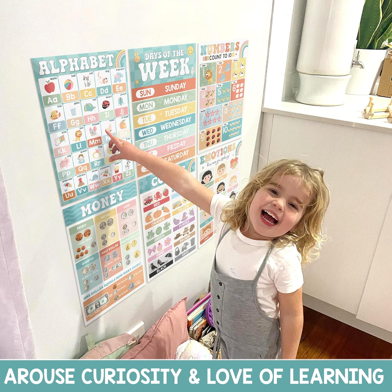 - Perfect for Early Learners, these 16 colorful, boho-inspired educational posters are designed specifically for toddlers aged 1-3. Covering essential topics like the alphabet, numbers, colors, shapes, and days of the week, these posters provide a fun and interactive way to build foundational skills. Not only are they visually captivating, but they also save time for parents and teachers. With simple, easy-to-follow content, these ready-to-use posters make tracking childrenโs educational progress a breeze, making them the ideal tool for fostering early learning in any home or classroom.