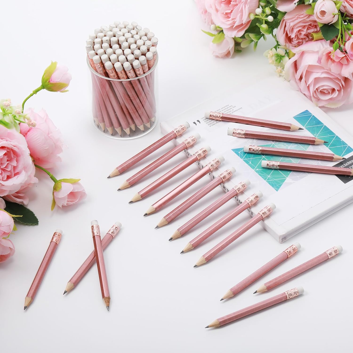 Outus 72 Pieces Golf Pencils Half Pencils with Eraser Mini Bulk Short #2 HB Pre Sharpened for Bridal Shower Wedding Office (Rose Gold)