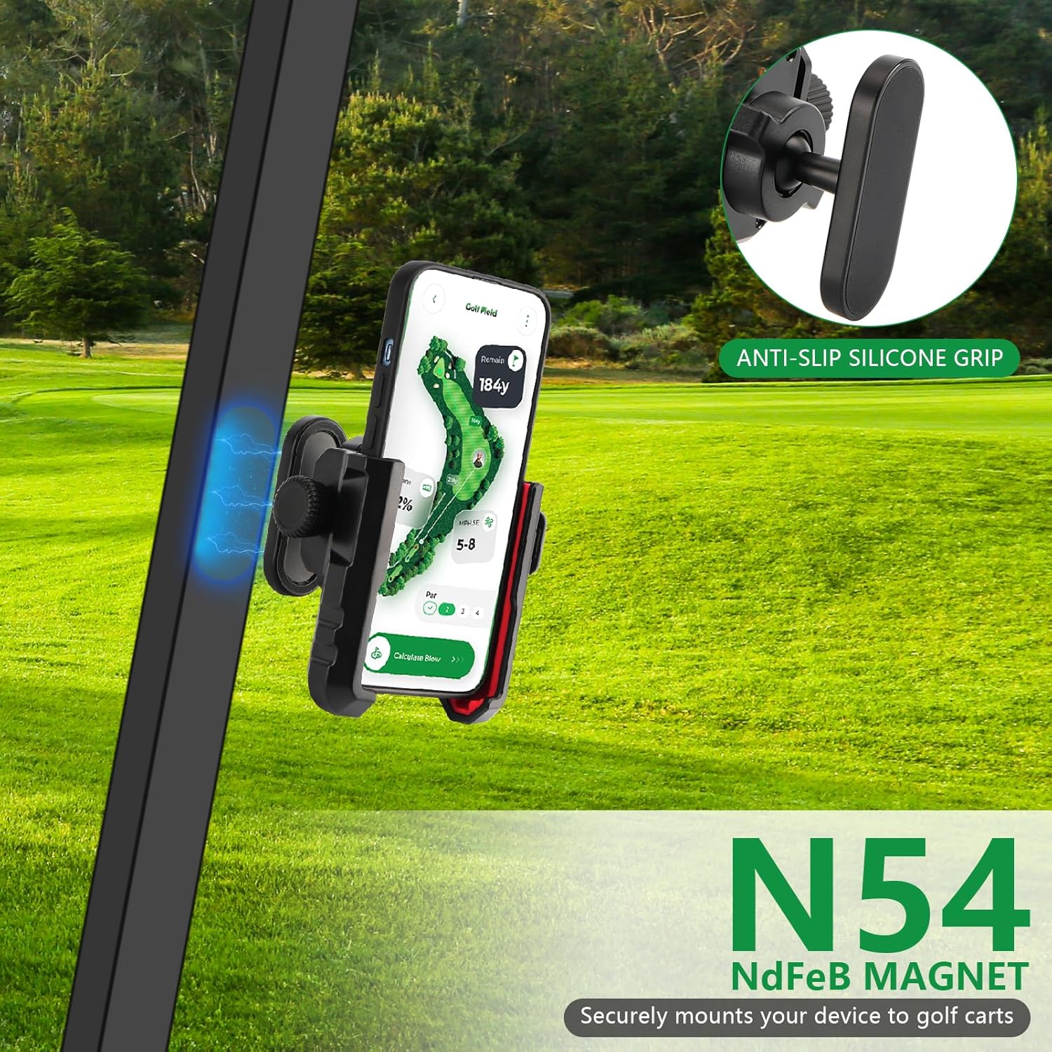 - 【POWERFUL N54 MAGNETIC BASE】Keep your phone secure on any terrain with our advanced magnetic golf cart phone holder. Equipped with upgraded N54 neodymium magnets (30% stronger than N52), this holder ensures unwavering stability through bumpy fairways and sudden stops. Simply attach to any metal surface on EZGO, Club Car, or Yamaha carts