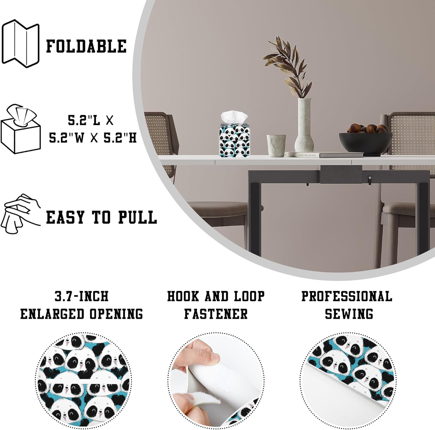 - Practical Design: The top of the square tissue box cover has a 3.7-inch enlarged opening for easily pulling out tissues without tearing or getting stuck. The strap at the bottom can firmly hold the tissue box in place and can be untied for easy replacement of new tissue boxes