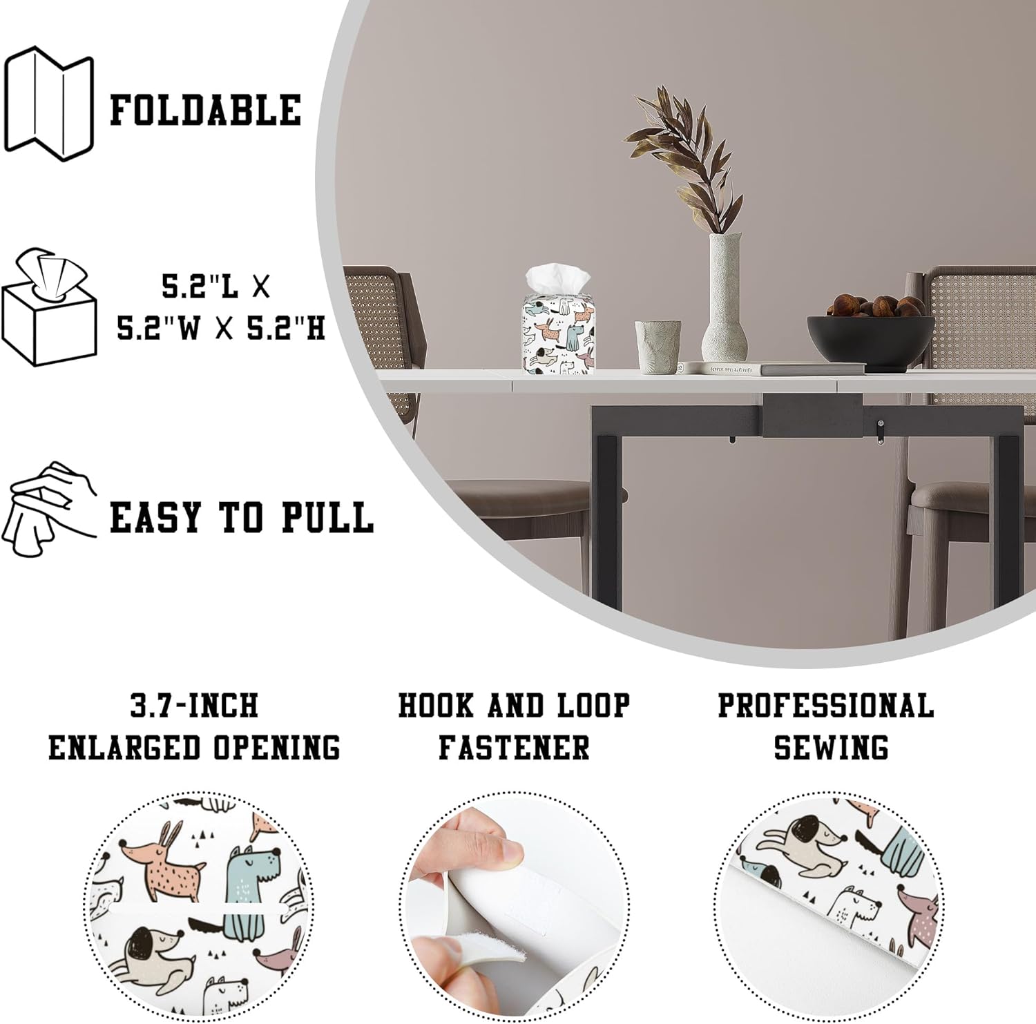 - Practical Design: The top of the square tissue box cover has a 3.7-inch enlarged opening for easily pulling out tissues without tearing or getting stuck. The strap at the bottom can firmly hold the tissue box in place and can be untied for easy replacement of new tissue boxes