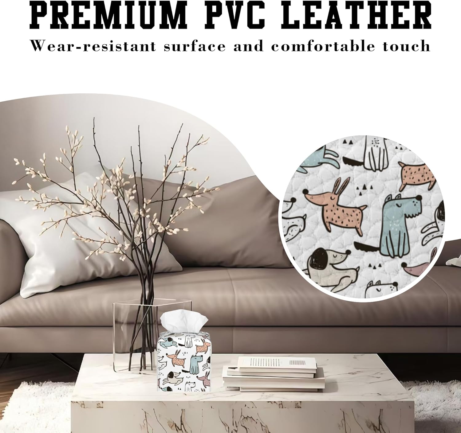Cute Doodle Dogs Tissue Box Cover Square, Tissue Box Holder Leather Facial Paper Case Decorative Organizer Holder Dispenser Home Office Car Decor