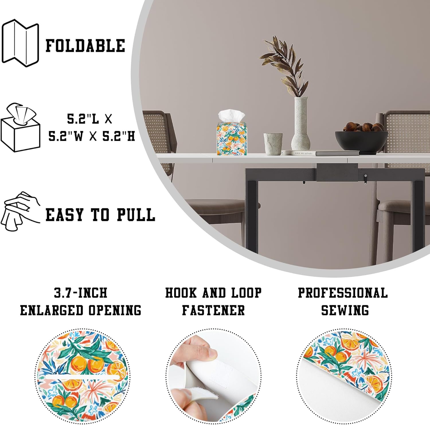 - Applicable Size: The tissue box cover measures 5.2"L x 5.2"W x 5.2"H, suitable for most square tissue boxes. It is designed to be compact, which can not only save space and keep the desktop tidy but also provide clean tissues at any time