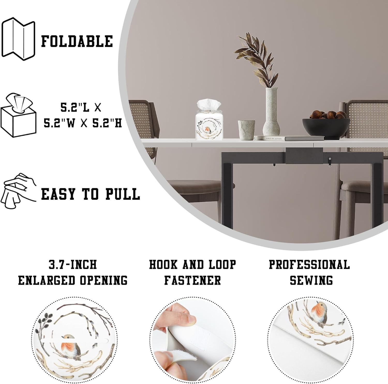 - Applicable Size: The tissue box cover measures 5.2"L x 5.2"W x 5.2"H, suitable for most square tissue boxes. It is designed to be compact, which can not only save space and keep the desktop tidy but also provide clean tissues at any time