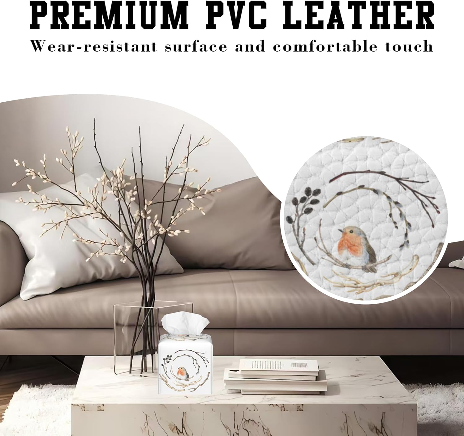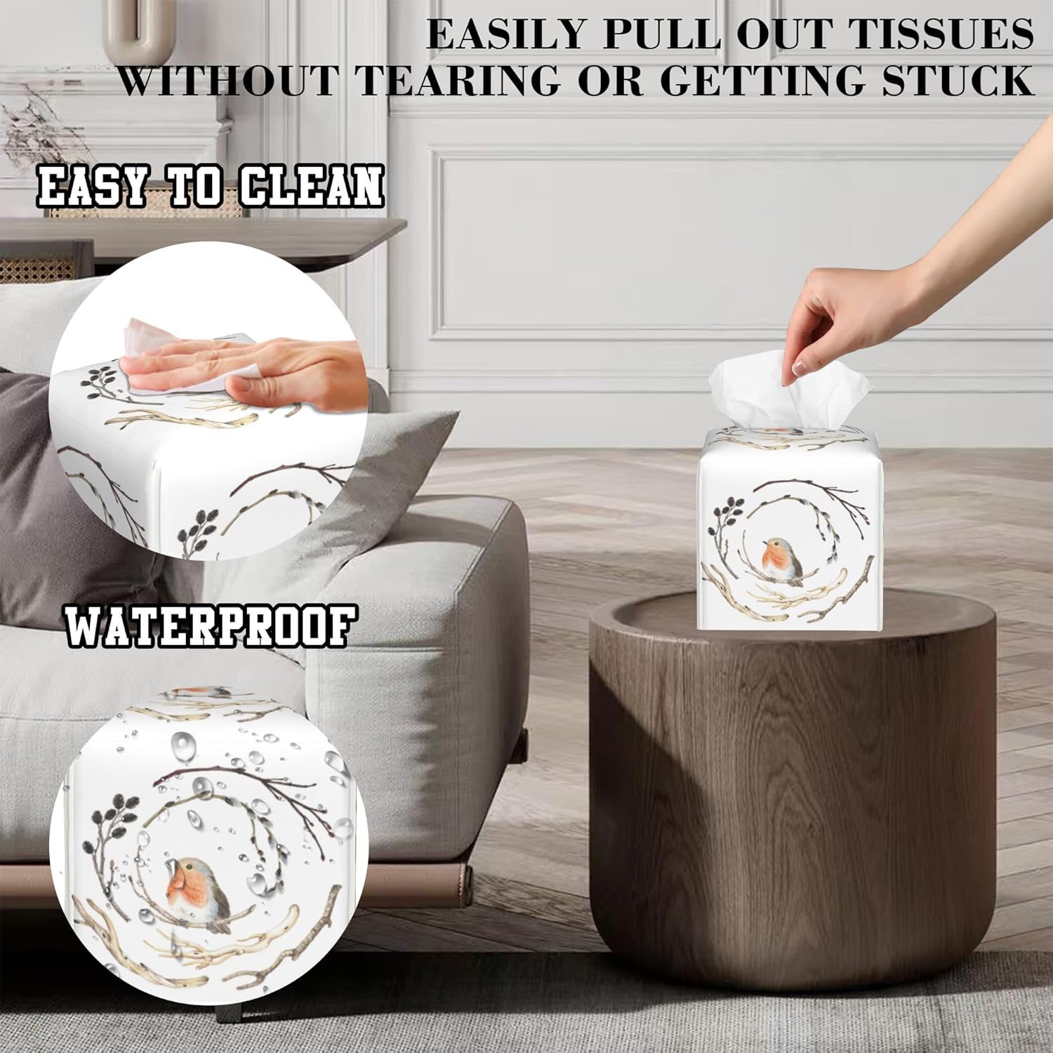 Watercolor Bird on Branches Tissue Box Cover Square, Tissue Box Holder Leather Facial Paper Case Decorative Organizer Holder Dispenser Home Office Car Decor