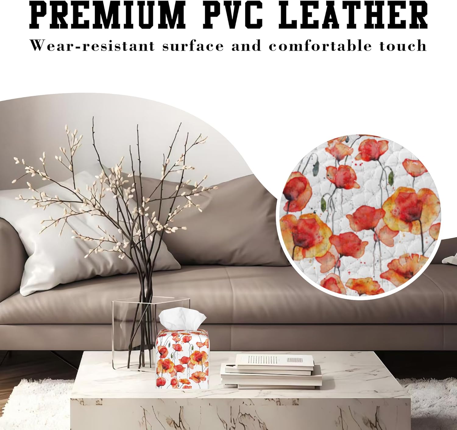 Watercolor Red Flowers Tissue Box Cover Square, Tissue Box Holder Leather Facial Paper Case Decorative Organizer Holder Dispenser Home Office Car Decor