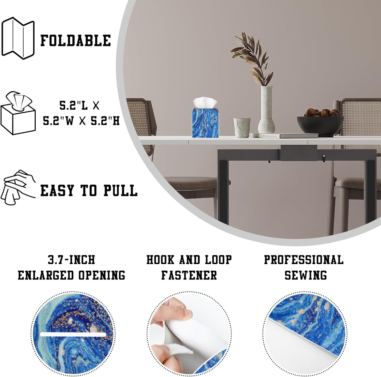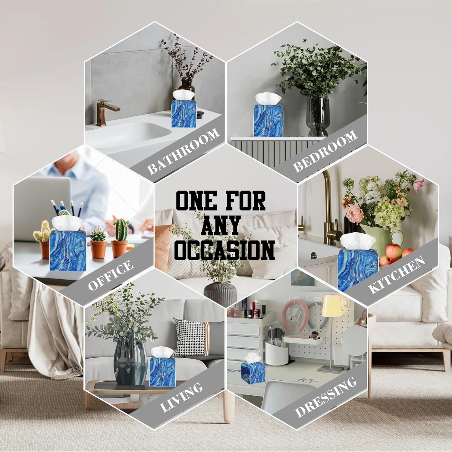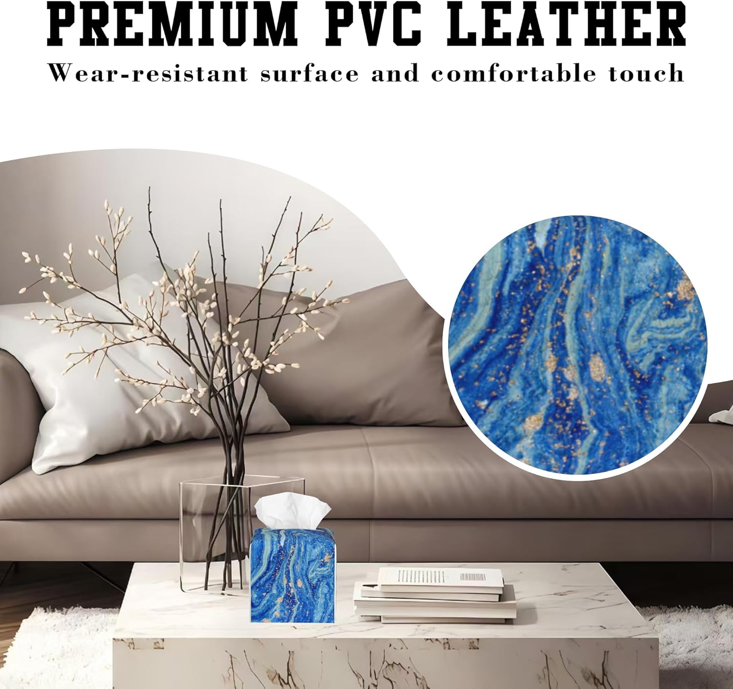 Blue and Gold Liquid Marble Tissue Box Cover Square, Tissue Box Holder Leather Facial Paper Case Decorative Organizer Holder Dispenser Home Office Car Decor