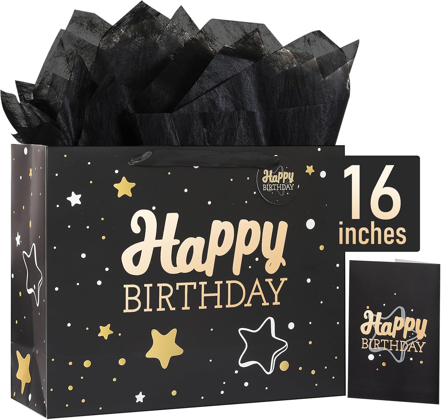 16" Black Happy Birthday Gift Bag with Tissue Paper and Greeting Card for Party,Happy Birthday Gift Bag for Men Women,Gift Bags Extra Large(1 PCS Black Hot Stamping)