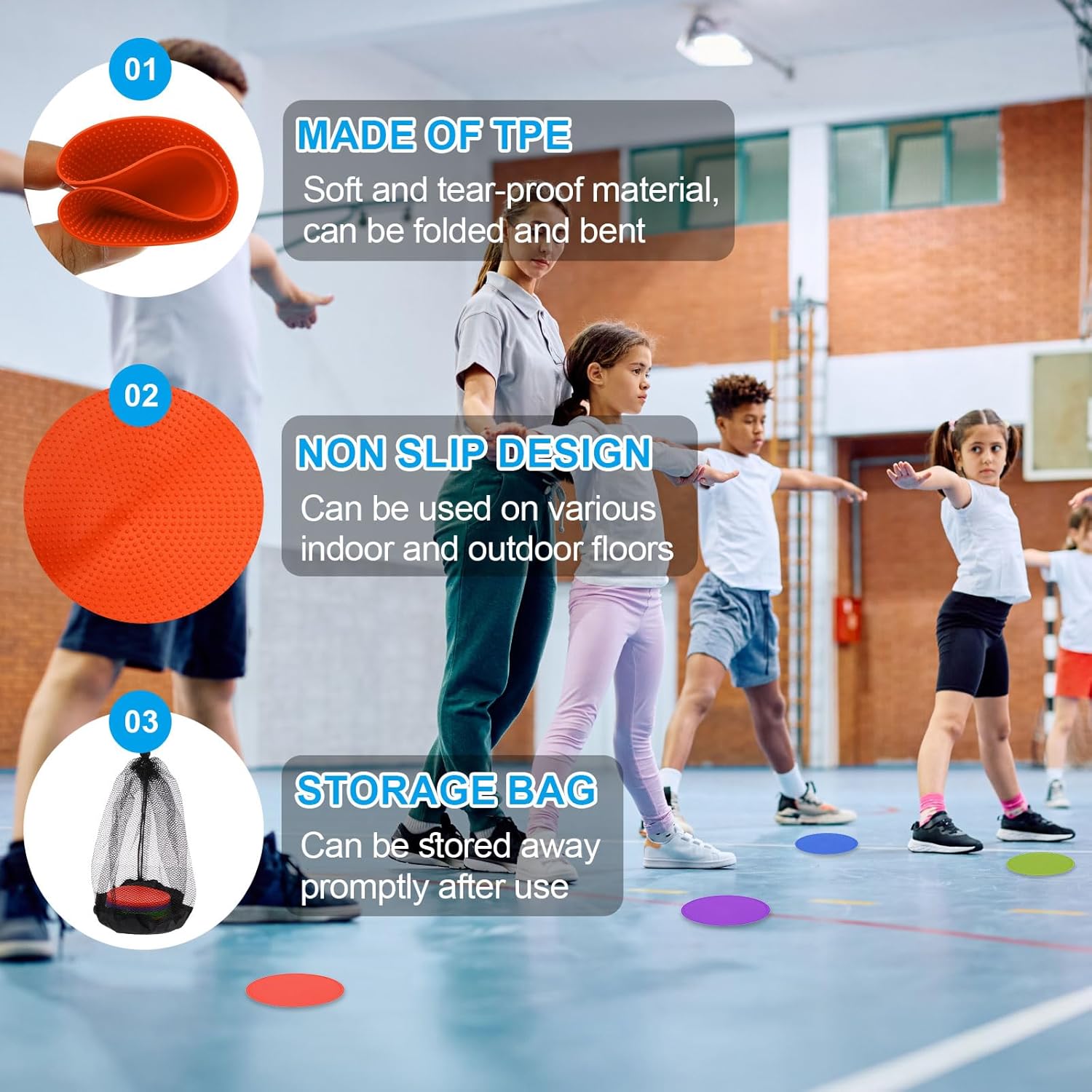 - Application: These poly spot markers are often used in homes, classrooms, playgrounds, and dance studios. They are convenient training accessories for agility training, sports training, fixed-point sitting, color tracking, classroom games, dance, sports, etc