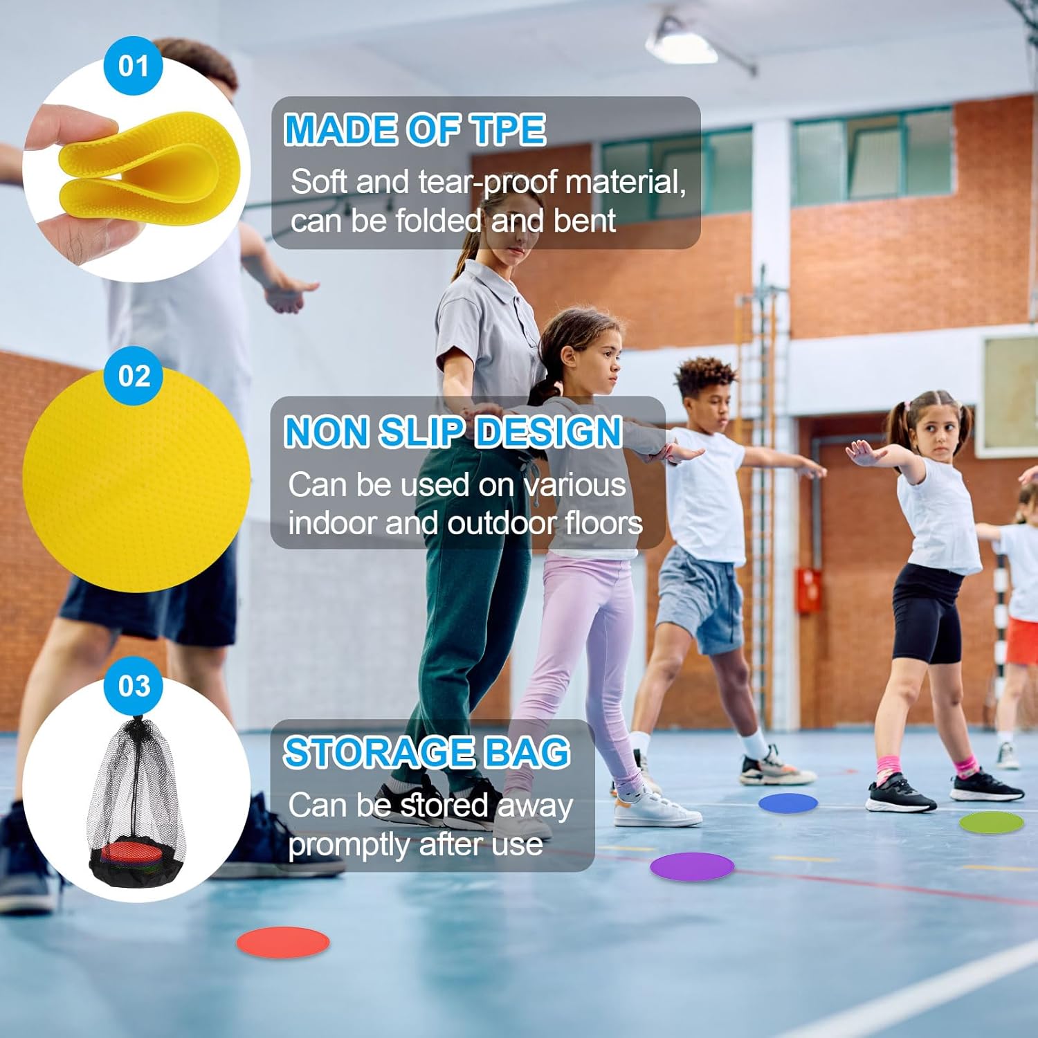 - Application: These poly spot markers are often used in homes, classrooms, playgrounds, and dance studios. They are convenient training accessories for agility training, sports training, fixed-point sitting, color tracking, classroom games, dance, sports, etc