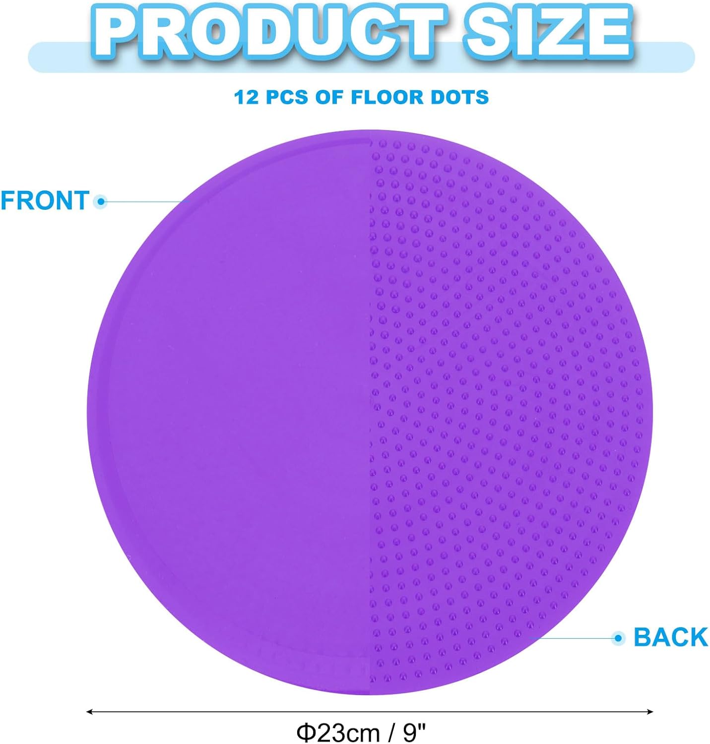 - Material: TPE; Color: Purple; Diameter: 23cm / 9.06inch; Packing List: 12pcs of floor dots, 1 pcs of storage bag