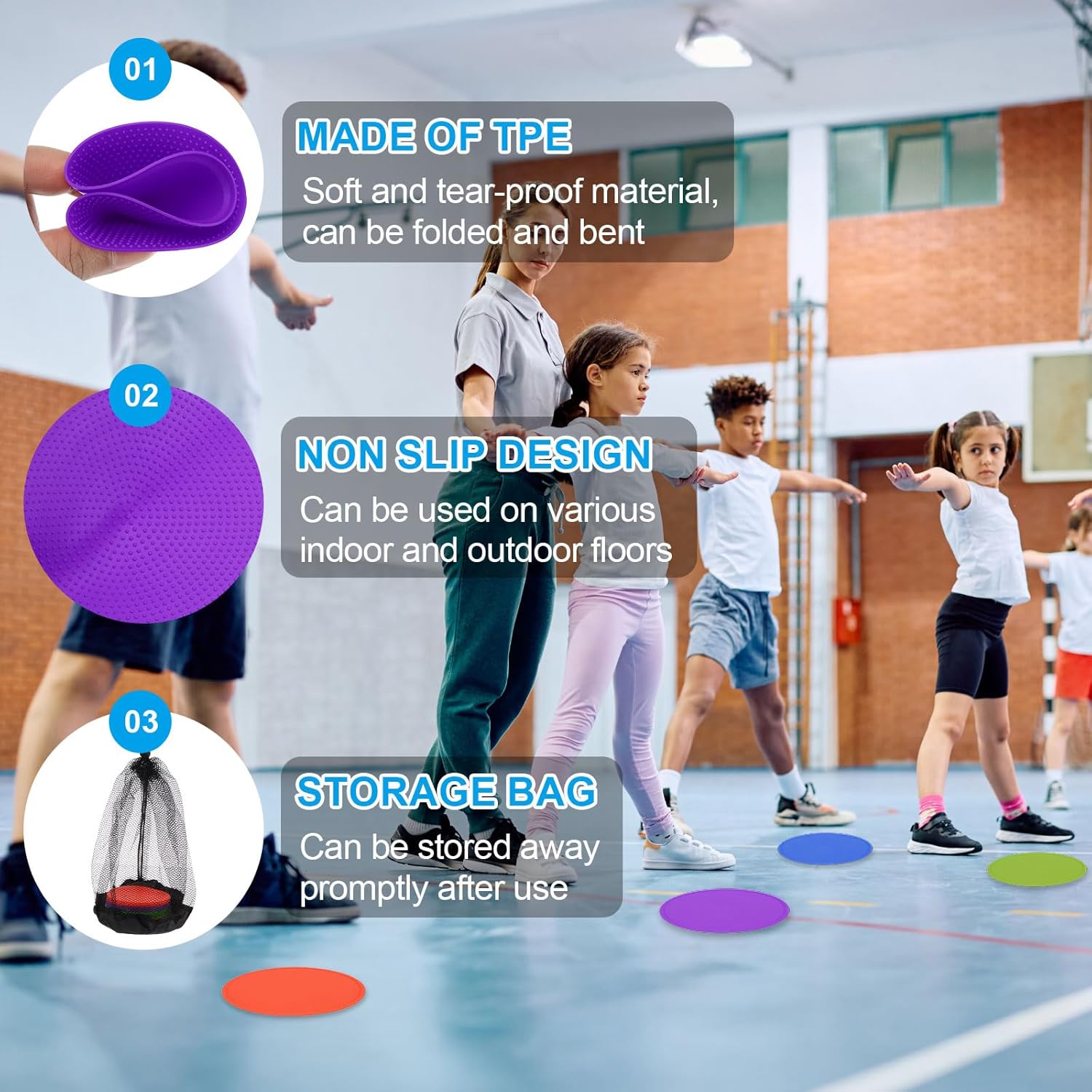- Application: These poly spot markers are often used in homes, classrooms, playgrounds, and dance studios. They are convenient training accessories for agility training, sports training, fixed-point sitting, color tracking, classroom games, dance, sports, etc