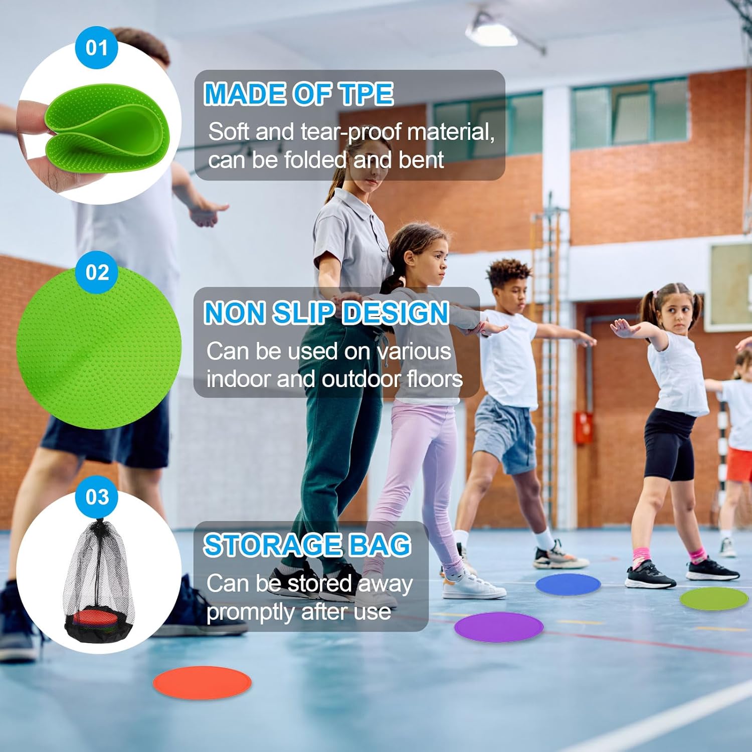 - Application: These poly spot markers are often used in homes, classrooms, playgrounds, and dance studios. They are convenient training accessories for agility training, sports training, fixed-point sitting, color tracking, classroom games, dance, sports, etc