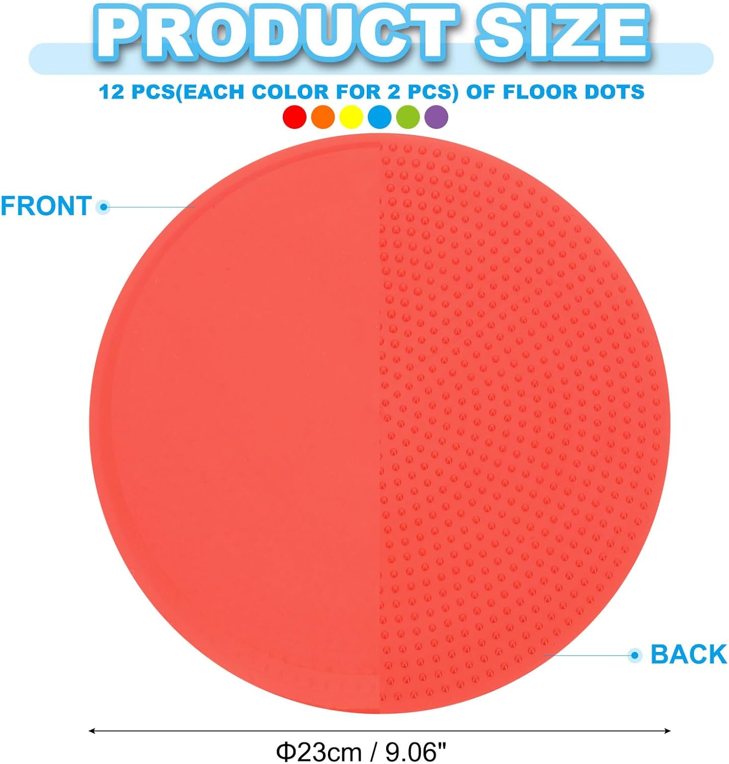 - Material: TPE; Color: Purple/Red/Green/Blue/Orange/Yellow; Diameter: 23cm / 9.06inch; Packing List: 12pcs of floor dots, 1 pcs of storage bag