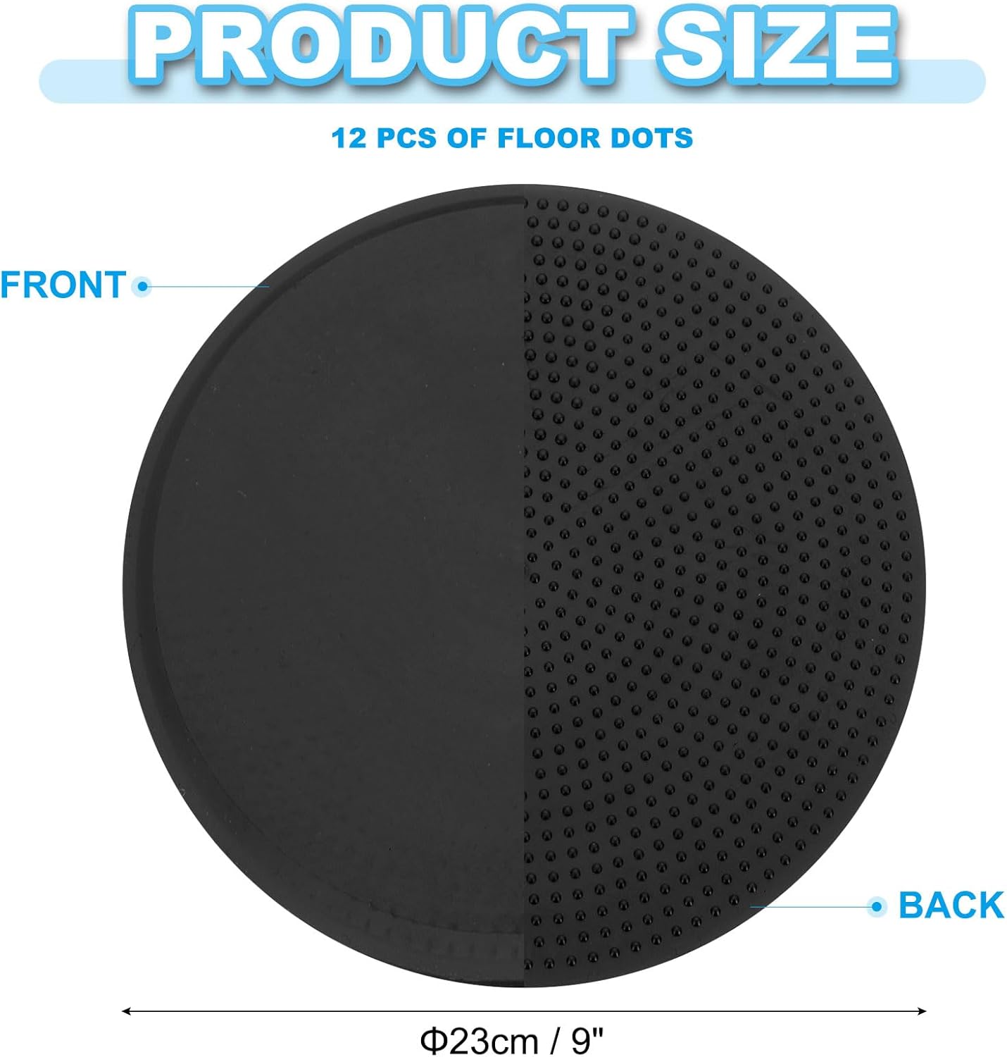 - Material: TPE; Color: Black; Diameter: 23cm / 9.06inch; Packing List: 12pcs of floor dots, 1 pcs of storage bag