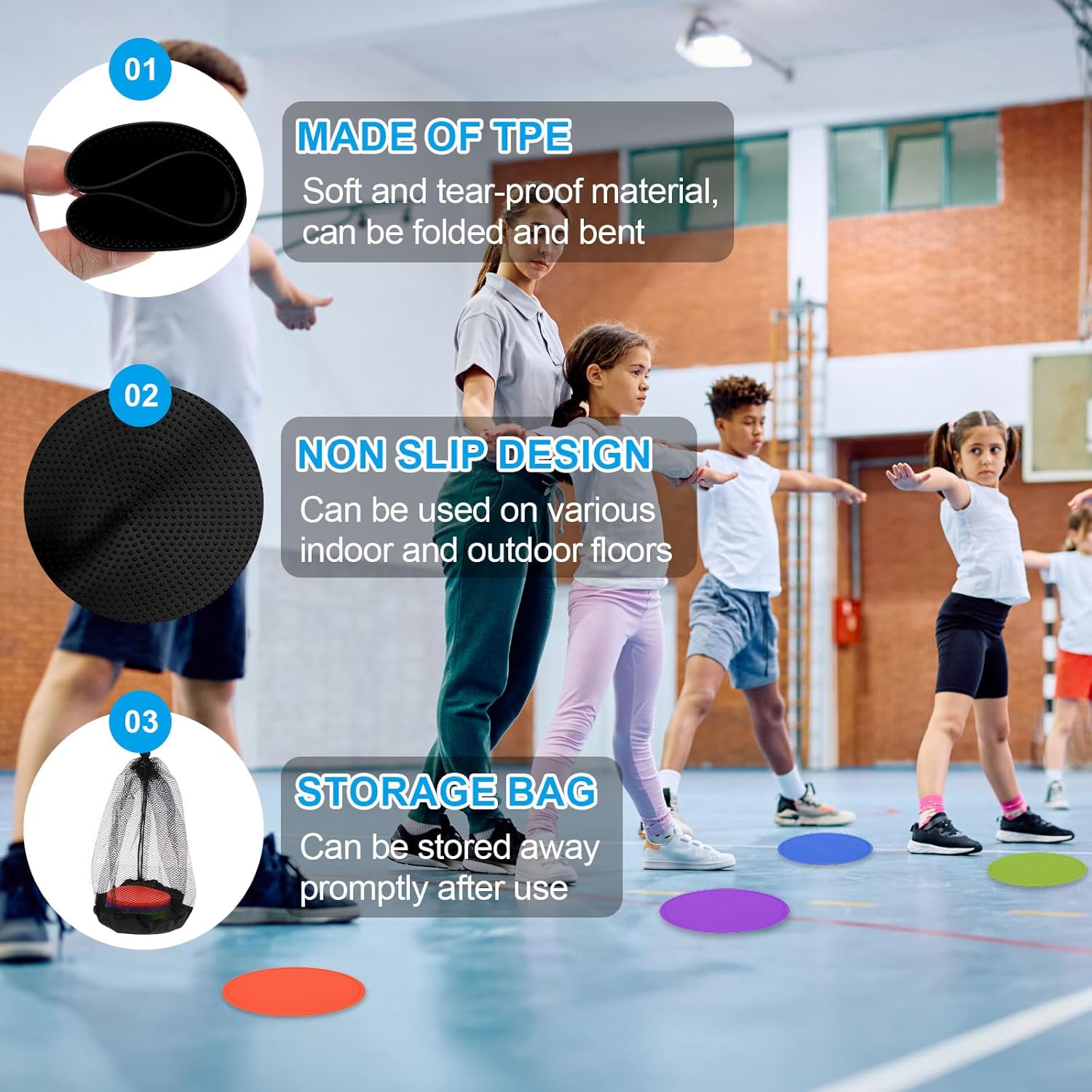 - Application: These poly spot markers are often used in homes, classrooms, playgrounds, and dance studios. They are convenient training accessories for agility training, sports training, fixed-point sitting, color tracking, classroom games, dance, sports, etc