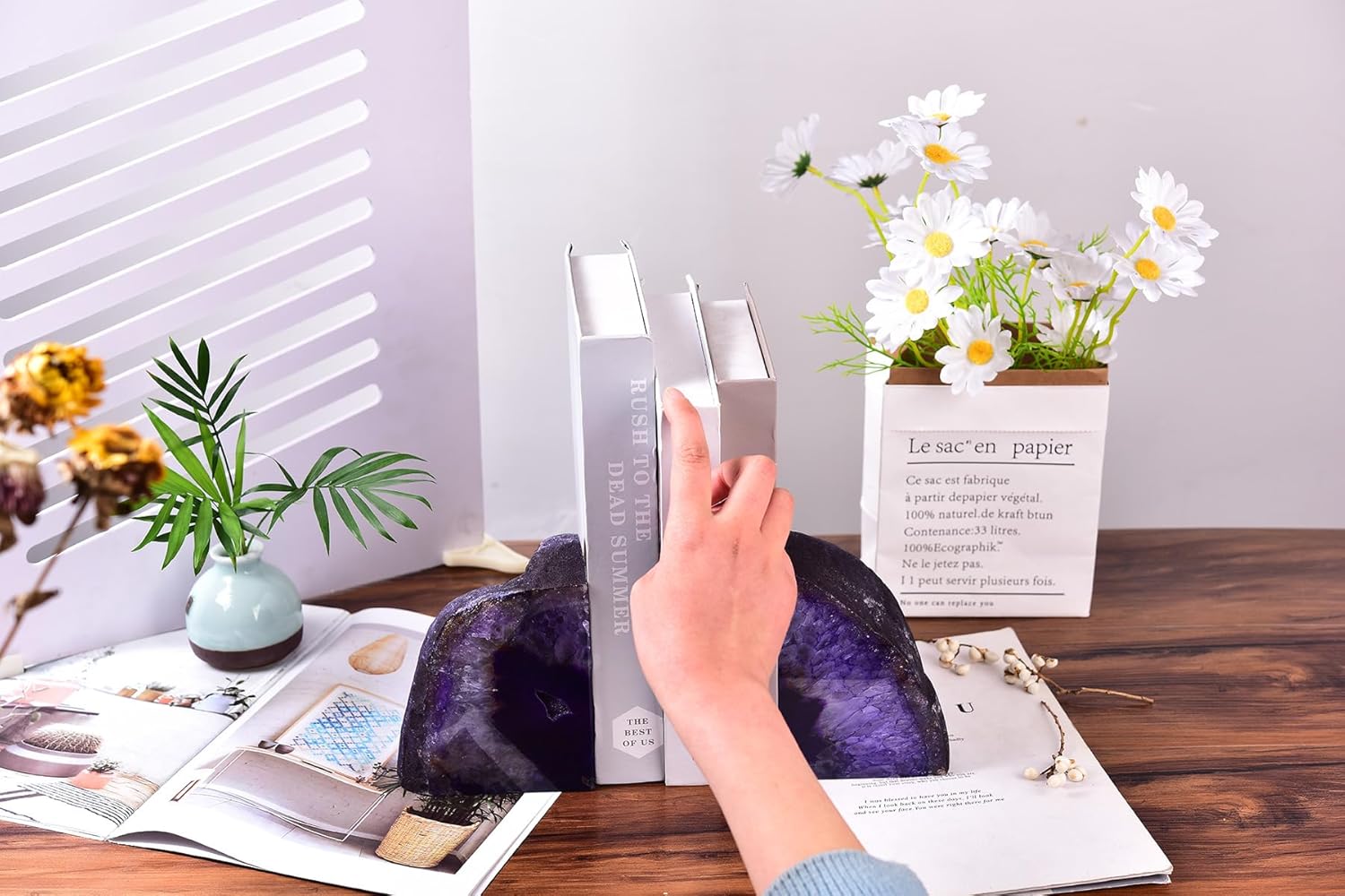 - Elegant Rock Bookends: Enhance your bookshelf or crystal altar with our decorative agate bookends. Dyed purple to adapt to various home decoration themes