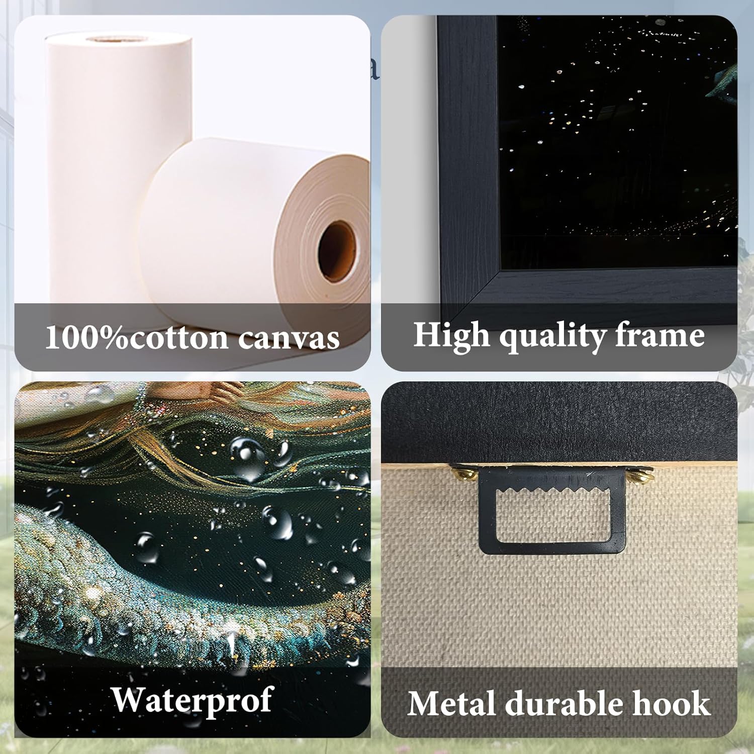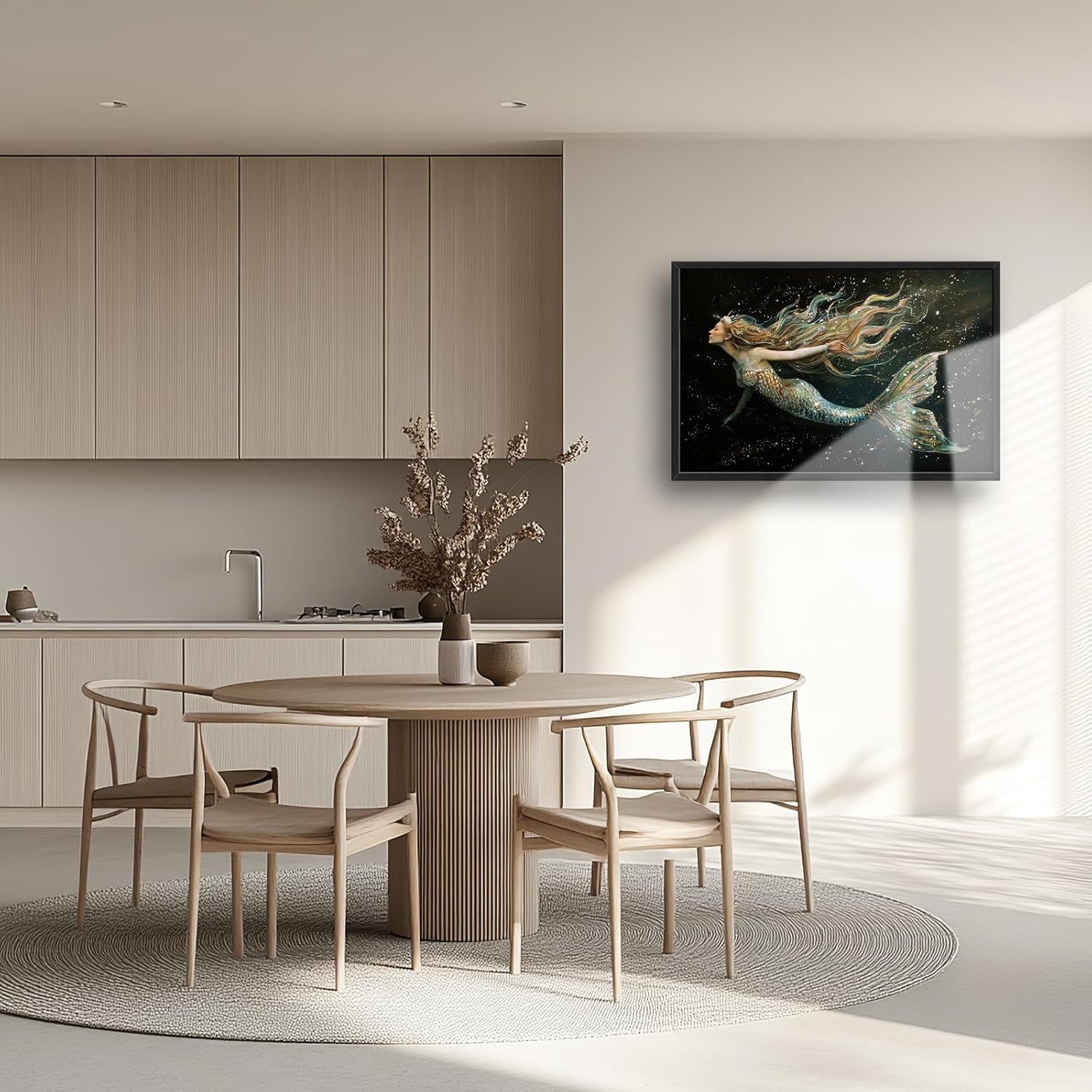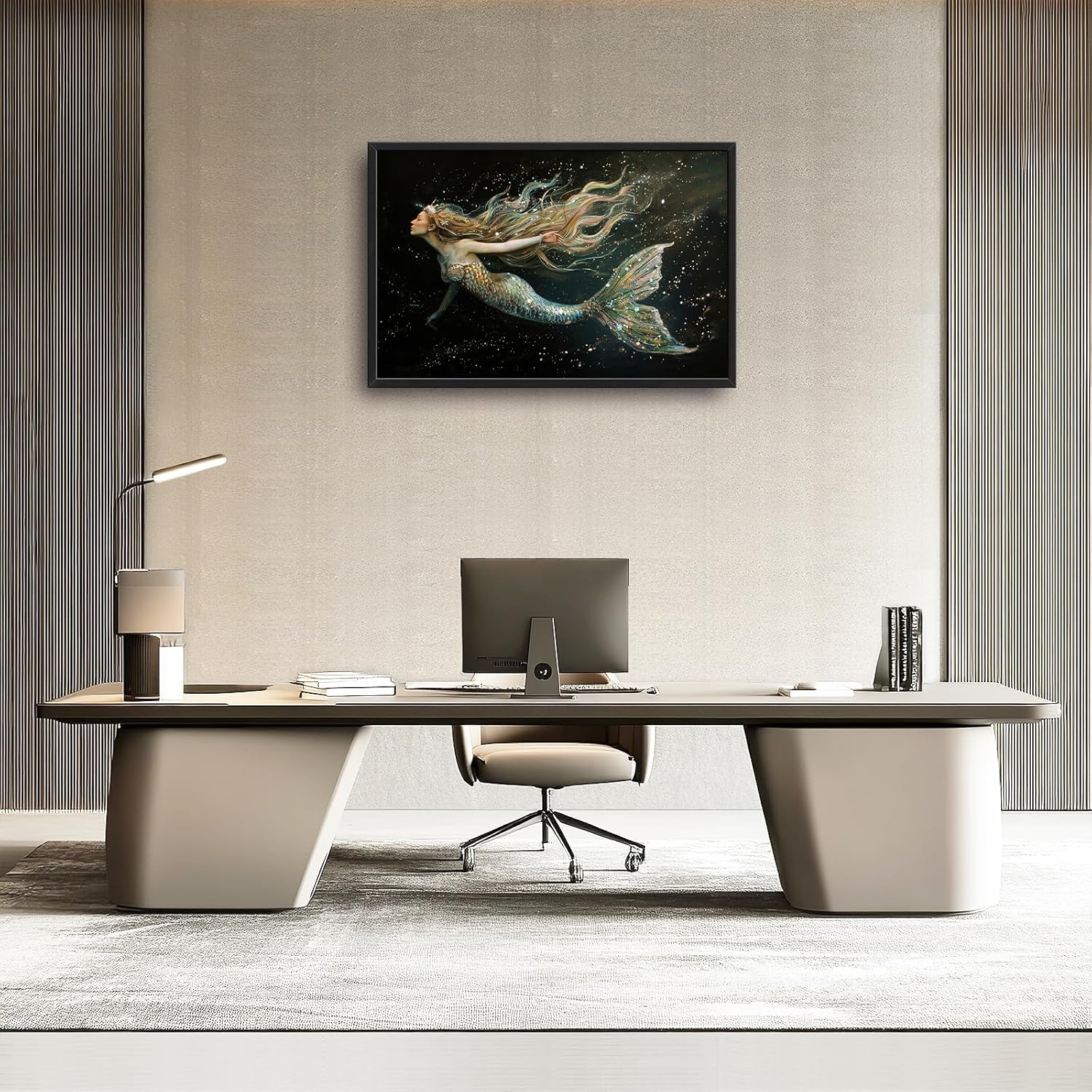Mermaid Large Framed Wall Art for Living Room Golden Mermaid Pictures Wall Decor Ocean Print Painting Artwork Modern Home Decoration for Bedroom Office 36x24 inch