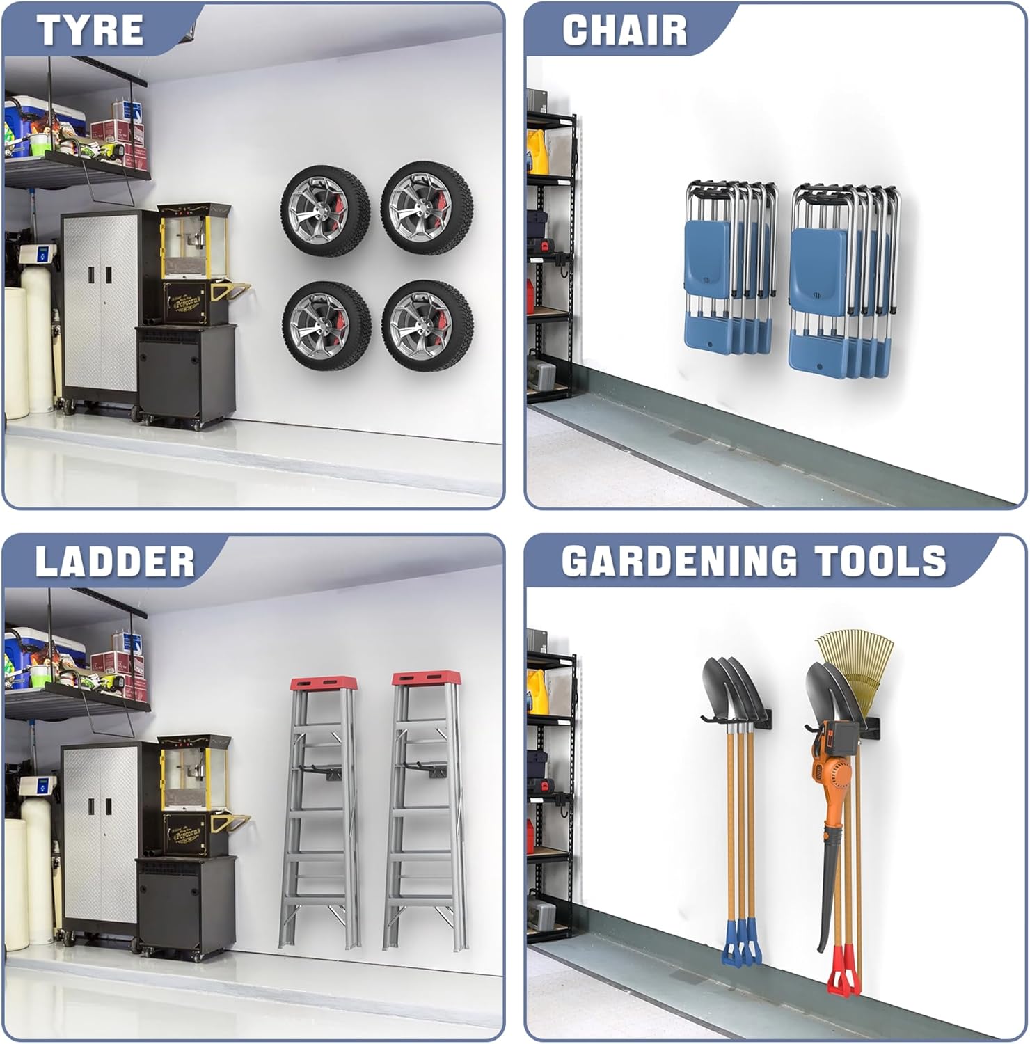 - Multi-Purpose Utility Hook: Great for organizing various items like garden tools, power equipment, sports gear, extension cords, folding chairs, and other bulky items in your garage, shed, or workshop