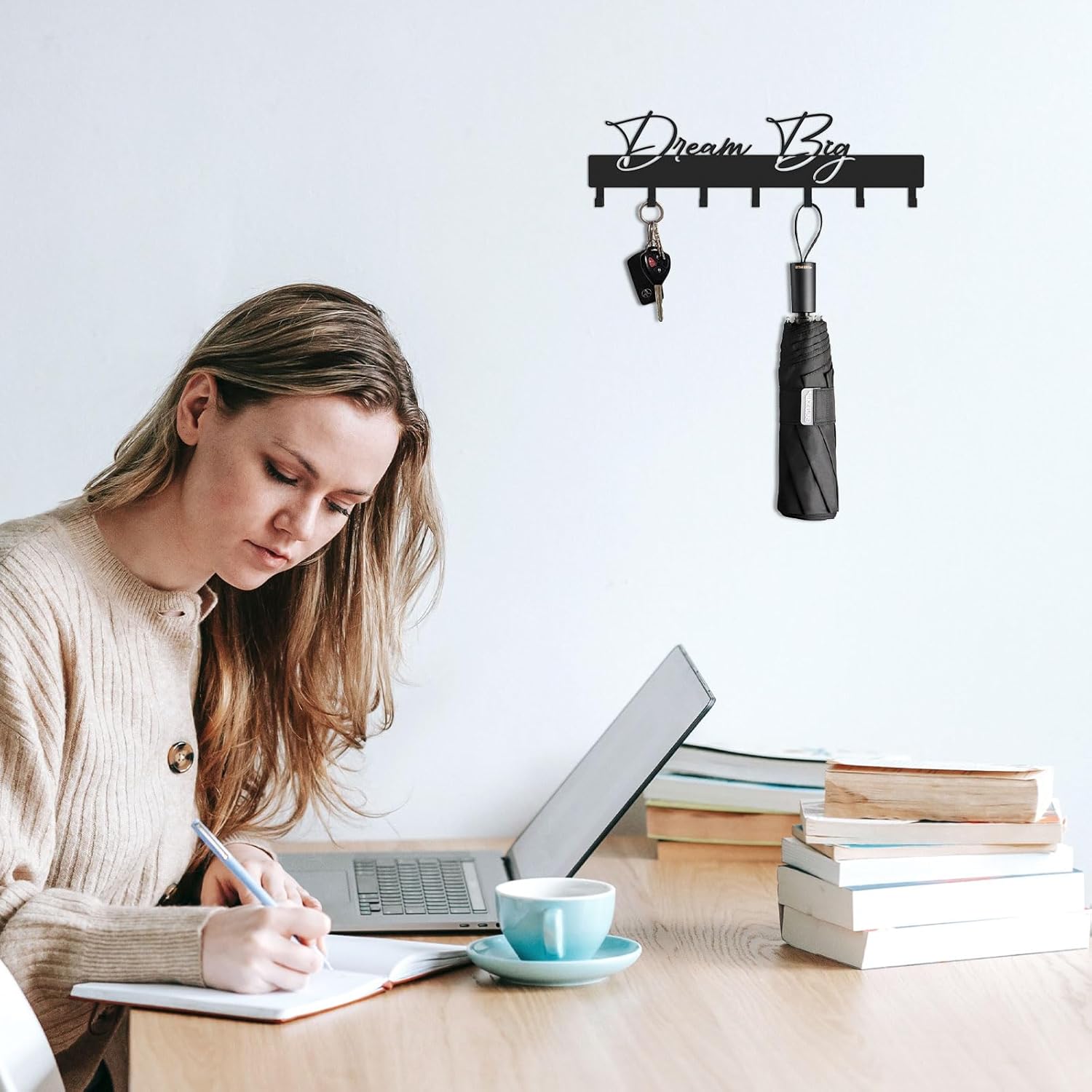 10 Inch Key Holder for Wall, Black Metal House Decoration Key Hooks, Phrase Style(Dream Big), Key Hanger Organizer with 7 Hooks, Suitable for Doors, Corridors, Living Rooms, Bedrooms