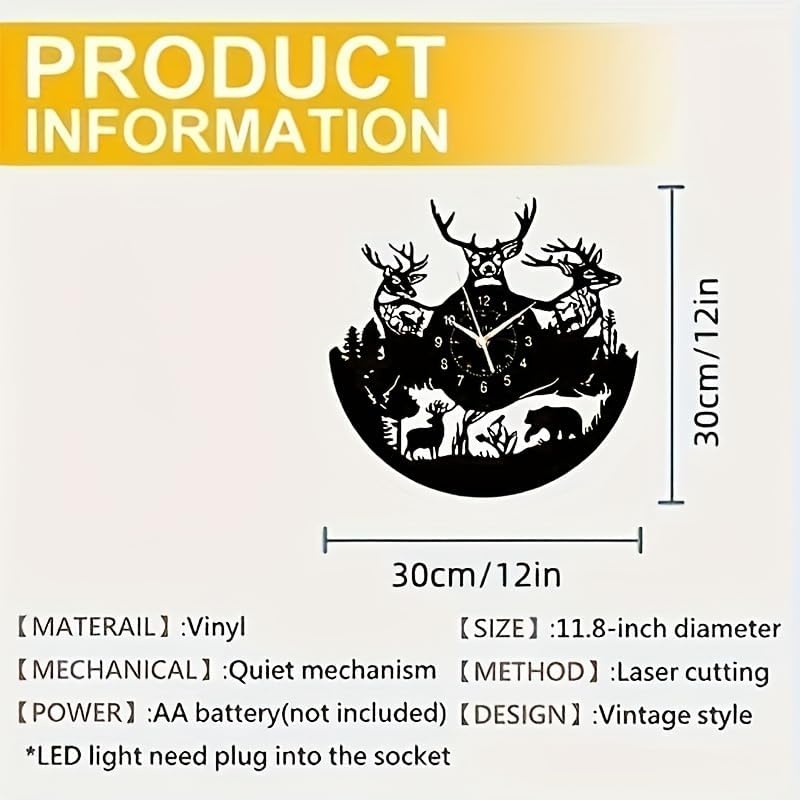 - DESIGN FEATURES: Vintage-style vinyl wall clock featuring a stunning wildlife scene with deer silhouettes and forest landscape in black cutout design