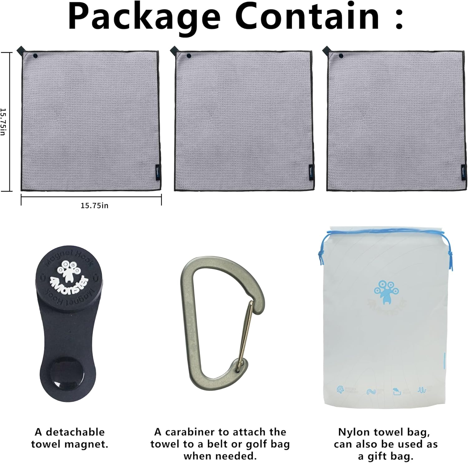 4Monster Golf Towels 3-Pack with Detachable Magnet and Portable Pouch, Quick-Dry Microfiber Golf Towel Set for Golf Bags,Custom Towel Gifts for Men or Women (3, Grey)