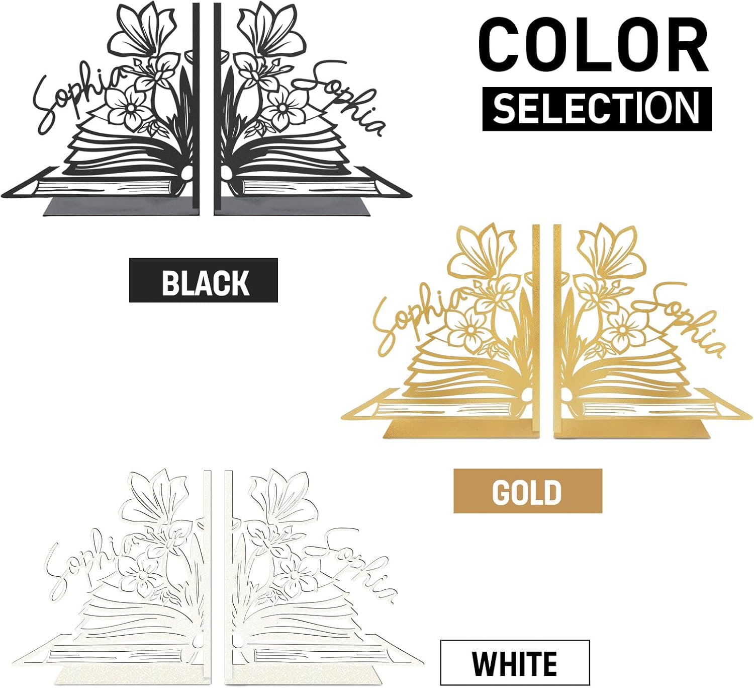 Personalized Flower Book Ends for Shelves 2 Pcs, Custom Name Metal Book Holders, Unique Bookends for Heavy Books, Non-Slip Book Stopper, Home Office Desk Bookshelf Decor, Customized Gifts