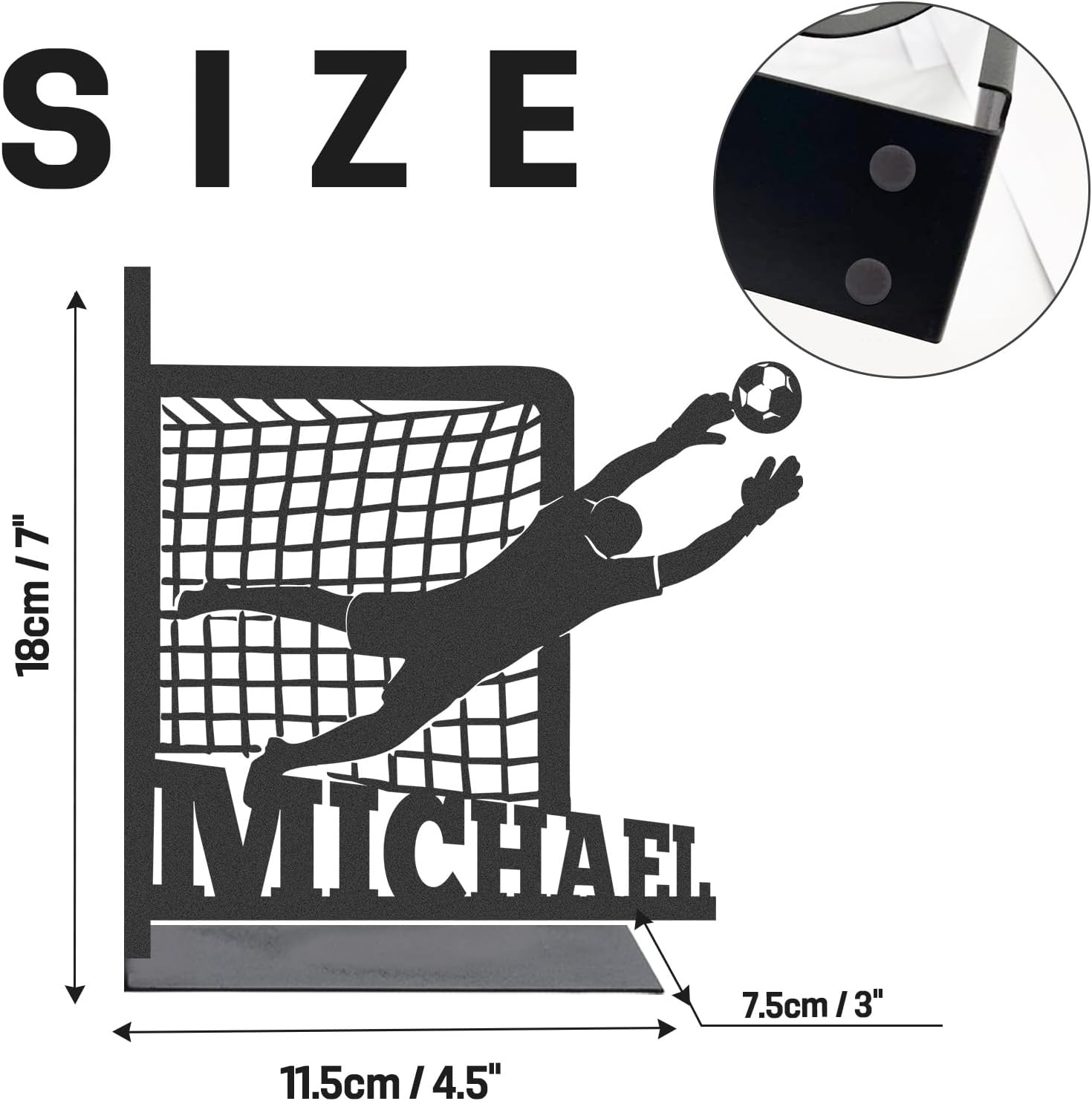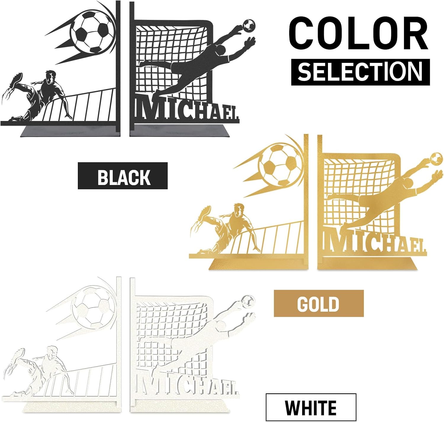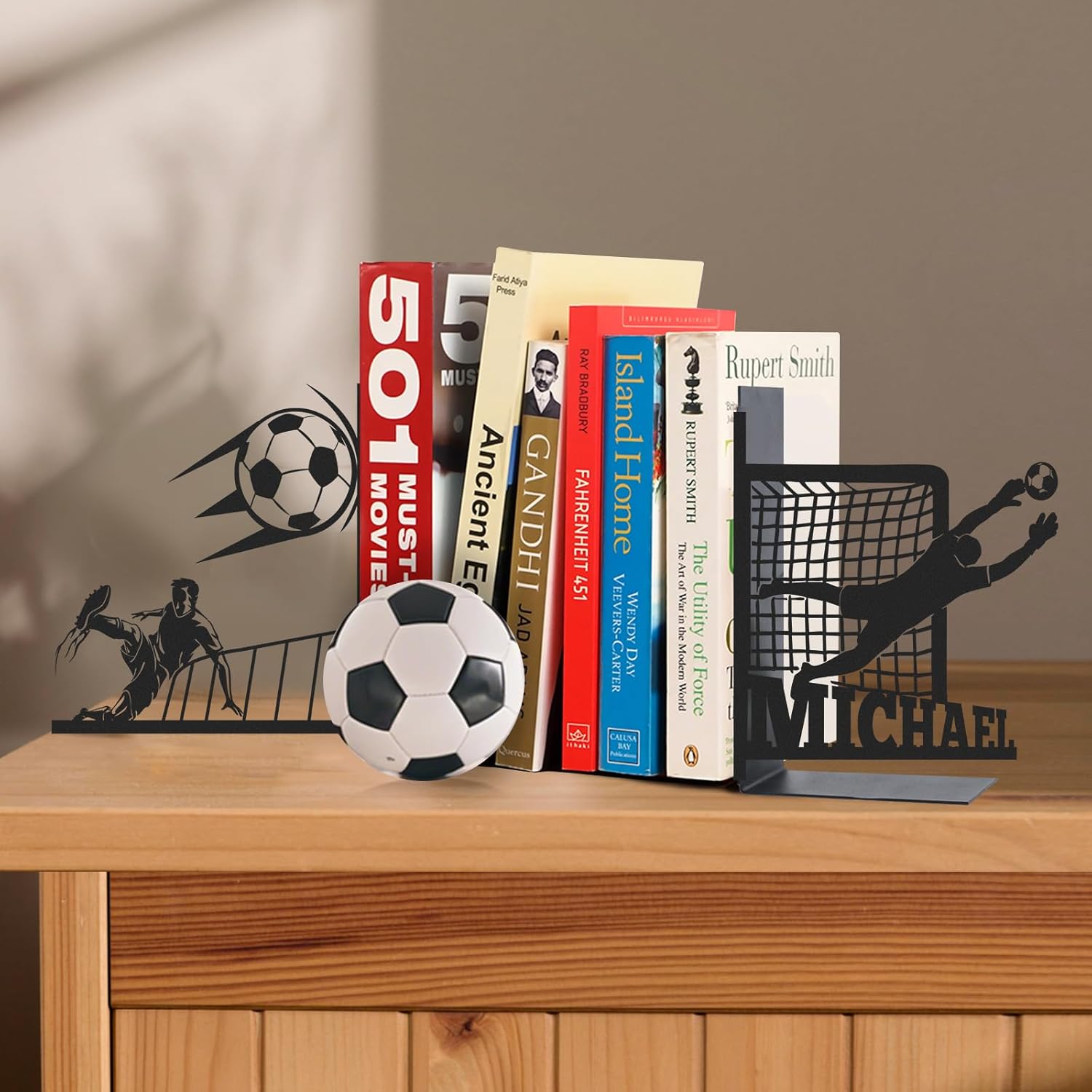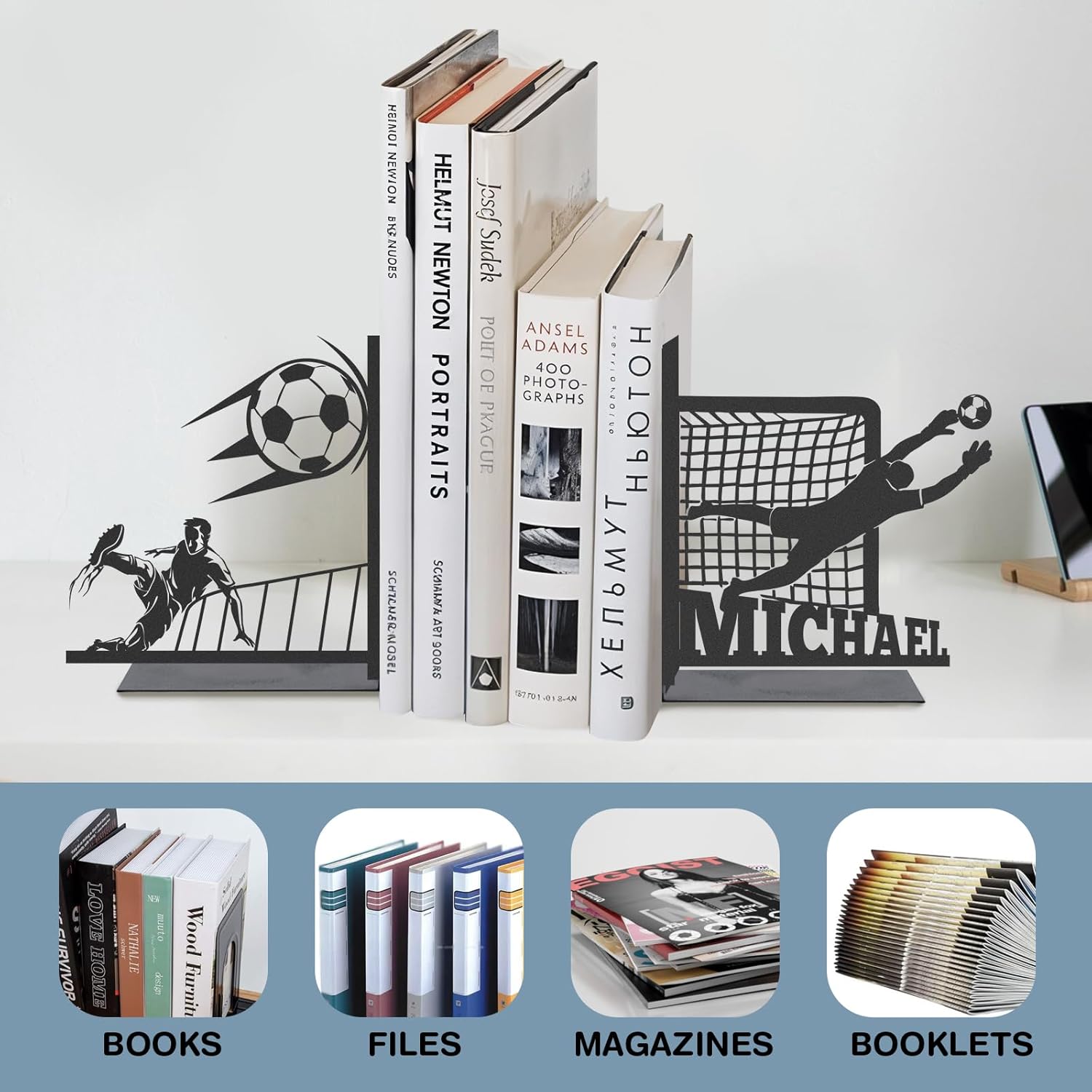Personalized Metal Book Ends for Shelves 2 Pcs, Custom Soccer Theme Decorative Bookends with Name, Non-Slip Book Stopper, Desk Book Organizer, Black Book Holders for Home Office, Gifts for Men