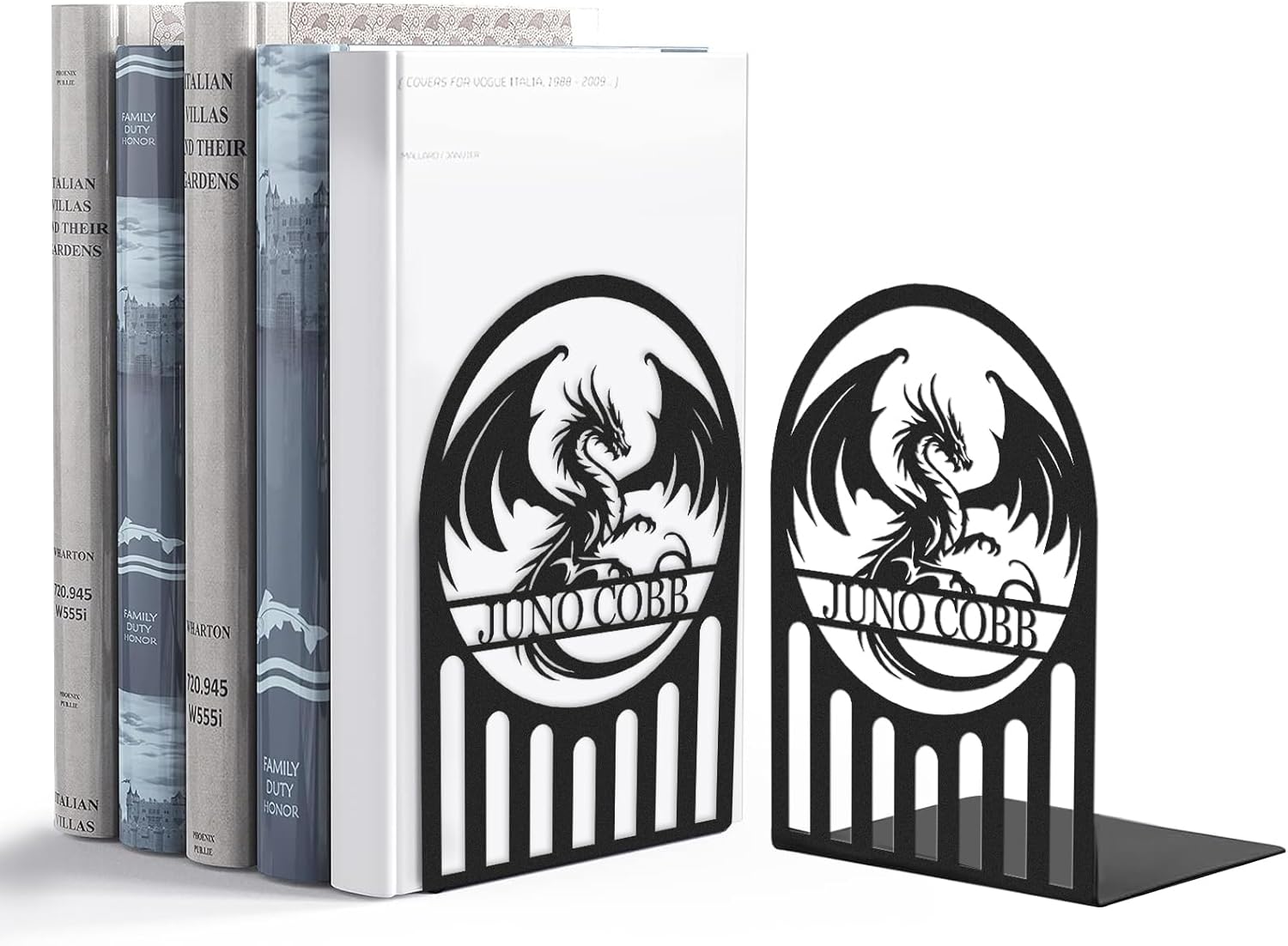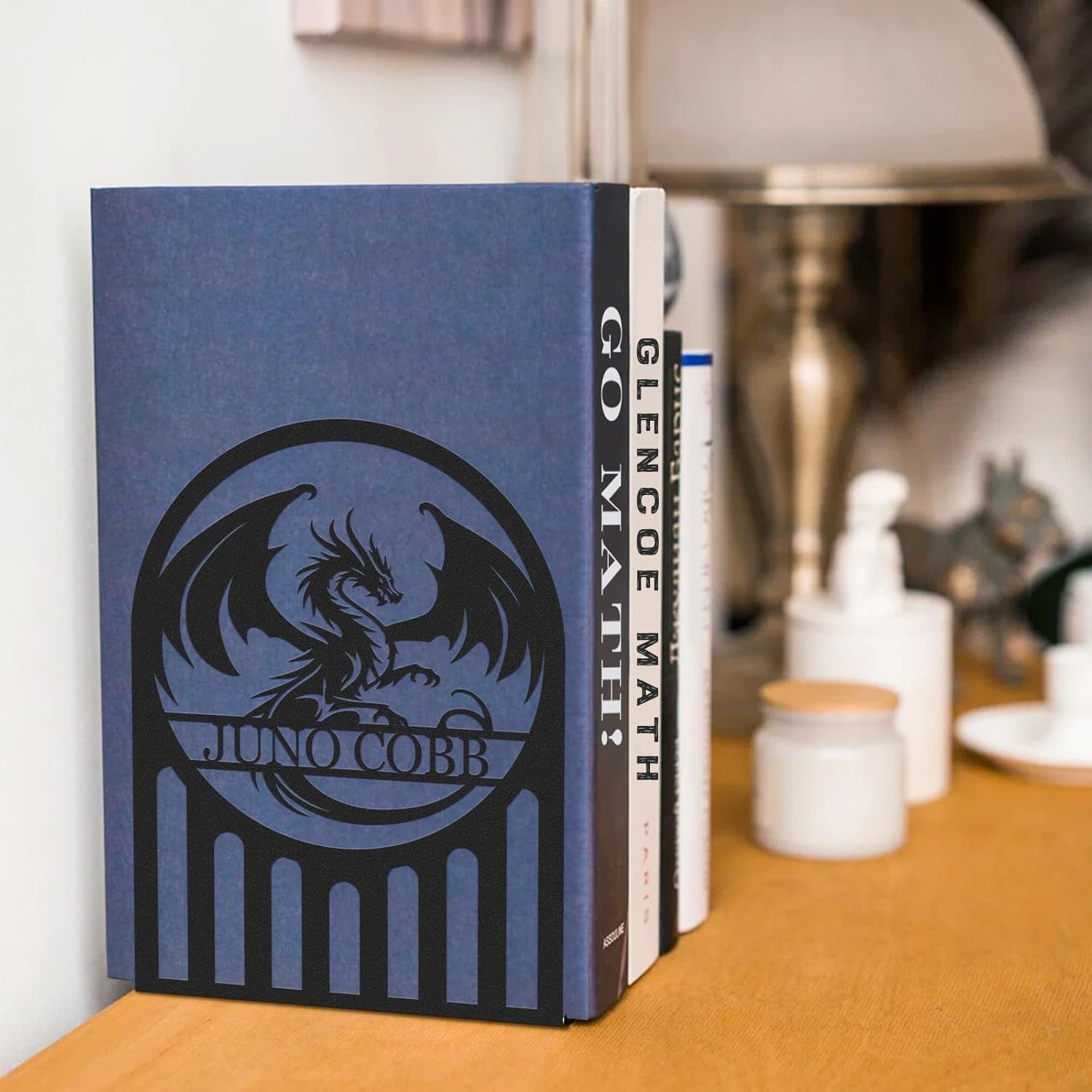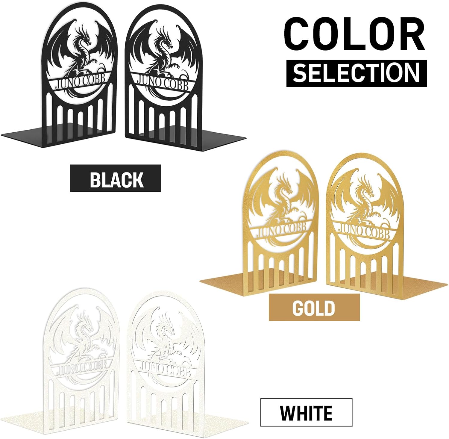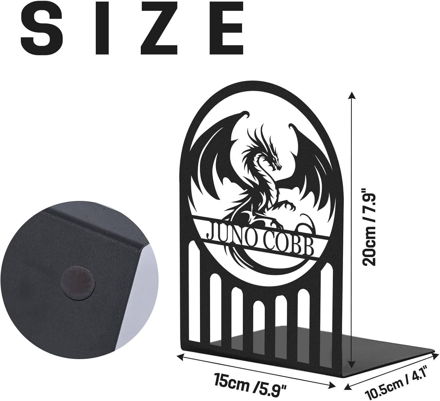 Personalized Dragon Book Ends 2 Pcs, Metal Bookends for Shelves, Custom Heavy Duty Bookends with Name, Dragon Bookshelf Decor, Book Organizer for Desk, Black Book Holders for Home Office