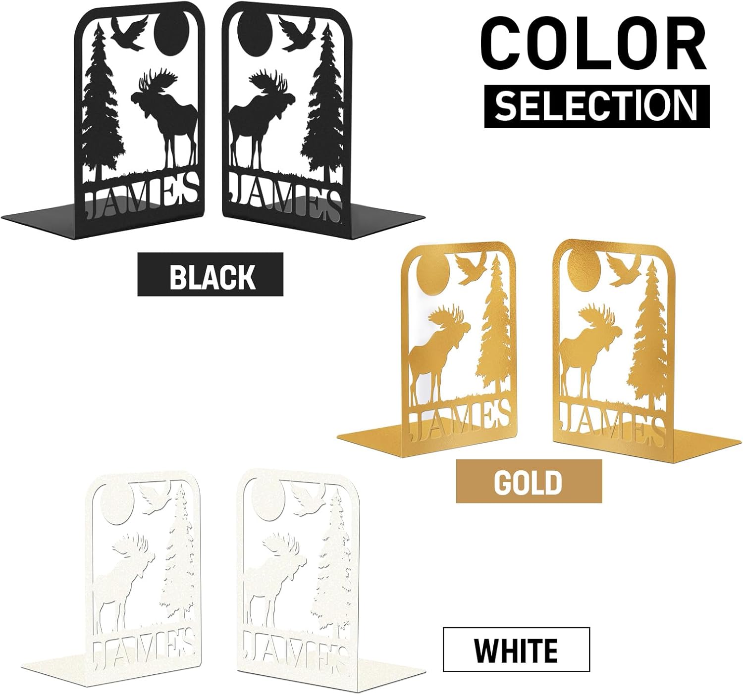 Custom Deer Metal Book Ends 2 Pcs, Forest Theme Bookends for Shelves Decorative, Heavy Duty Bookend Stopper, Deer Cabin Decor, Book Organizer for Desk, Black Book Holders for Home Office, Hunter Gifts