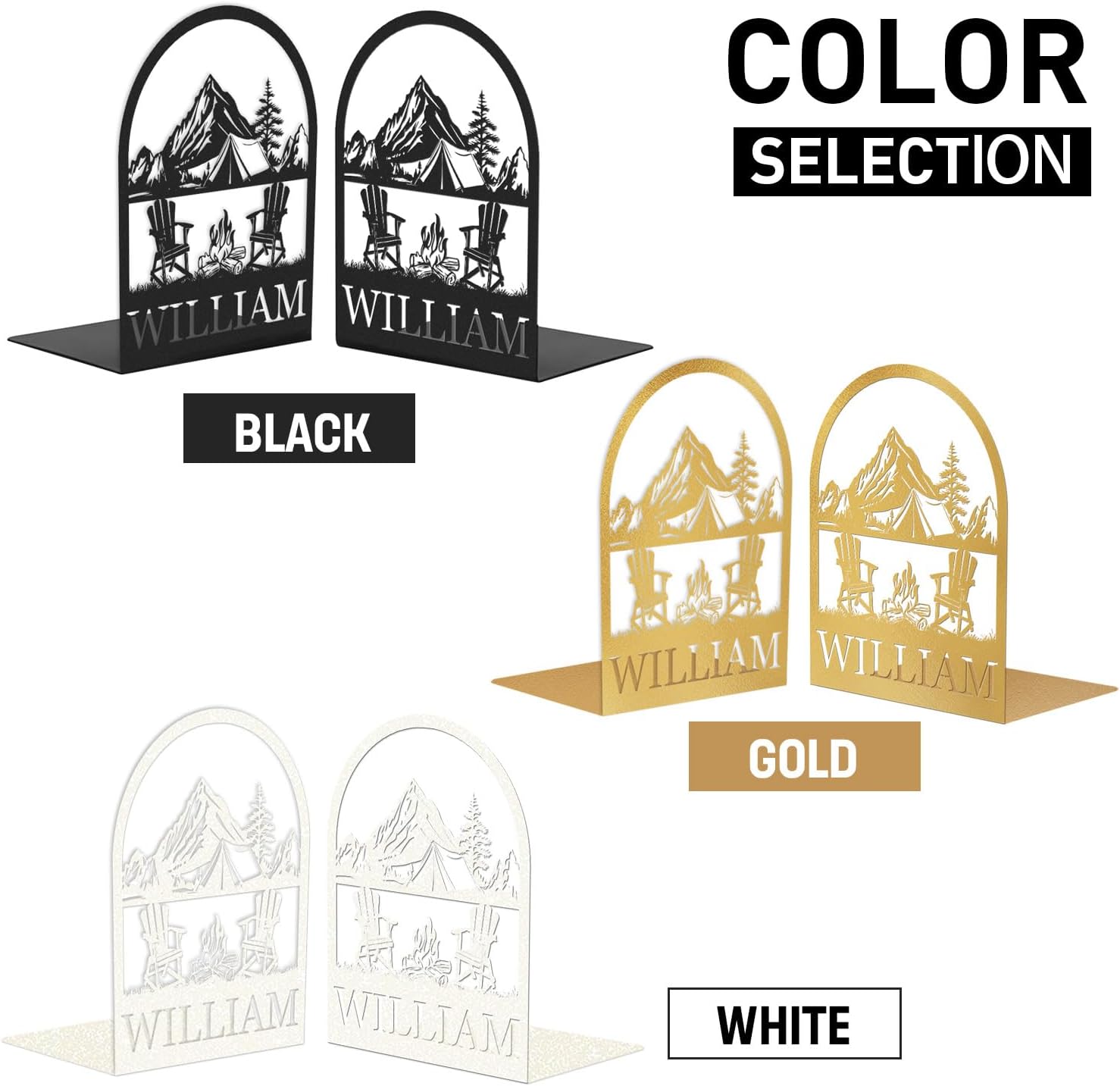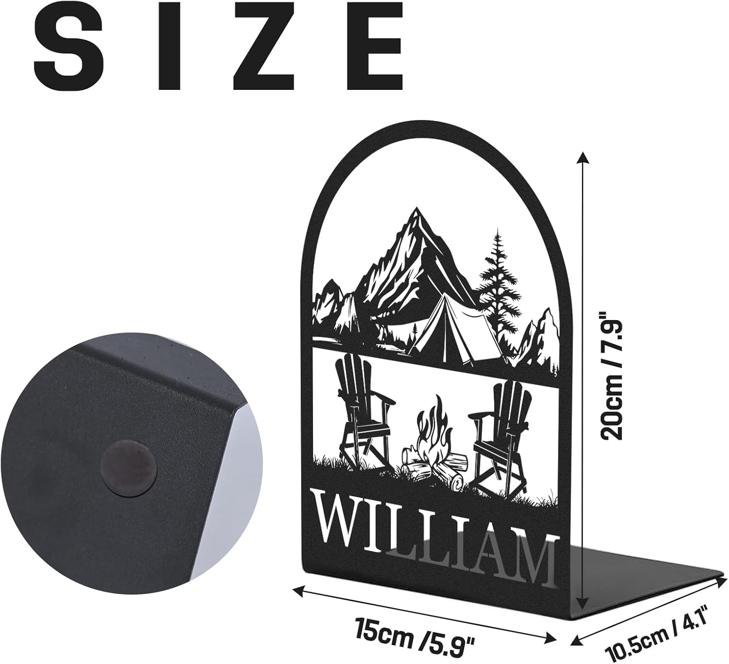Personalized Name Metal Book Ends 2 Pcs, Modern Bookends for Shelves, Book Stopper for Heavy Books, Camping Bookshelf Decor, Book Organizer for Desk, Book Holders for Home Office, Gifts for Camper