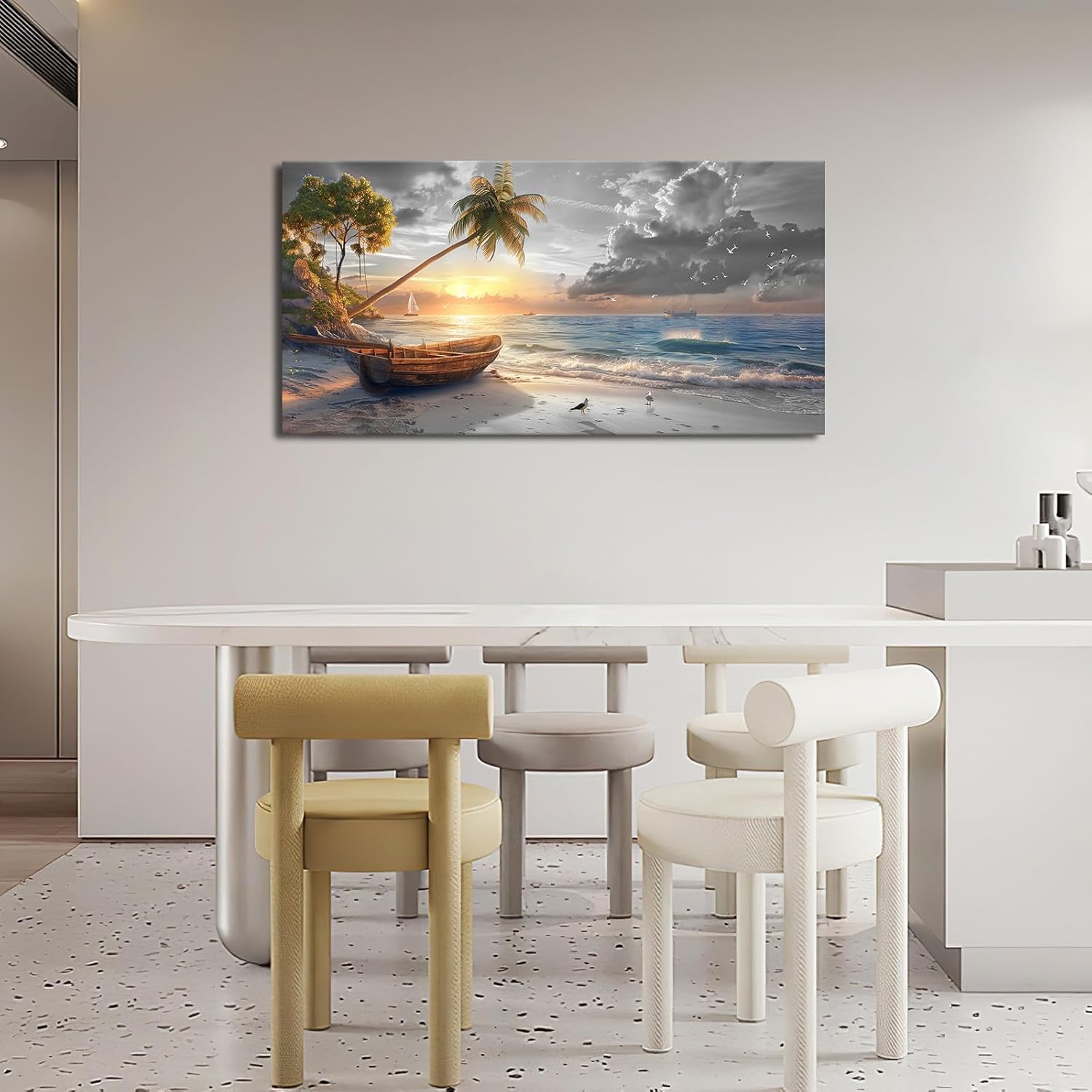 Large Coastal Living Room Wall Art Summer Beach Canvas Wall Decor Black White Ocean Seascape Pictures Painting Hawaii Scenery Home Decoration Giant Boat Seagull Artwork for Bedroom Framed 30"x60"