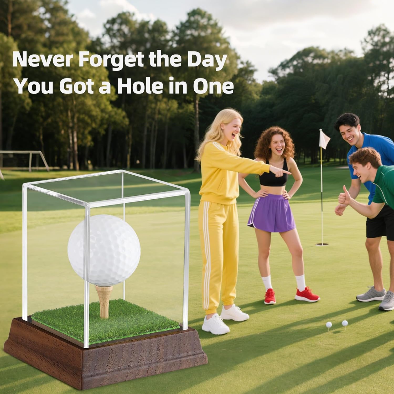- 【Golf ball display case】Our Hole In One Golf Ball Display Case, Including Walnut Wood Base + Clear Acrylic Cube + Lifelike Artificial Turf + Wooden Golf Tee , Overall size 3.54''x3.54''x4.01'', Stackable ,Great for displaying Hole In One Golf Ball,memorabilia,jewelry,toys, trinkets etc.